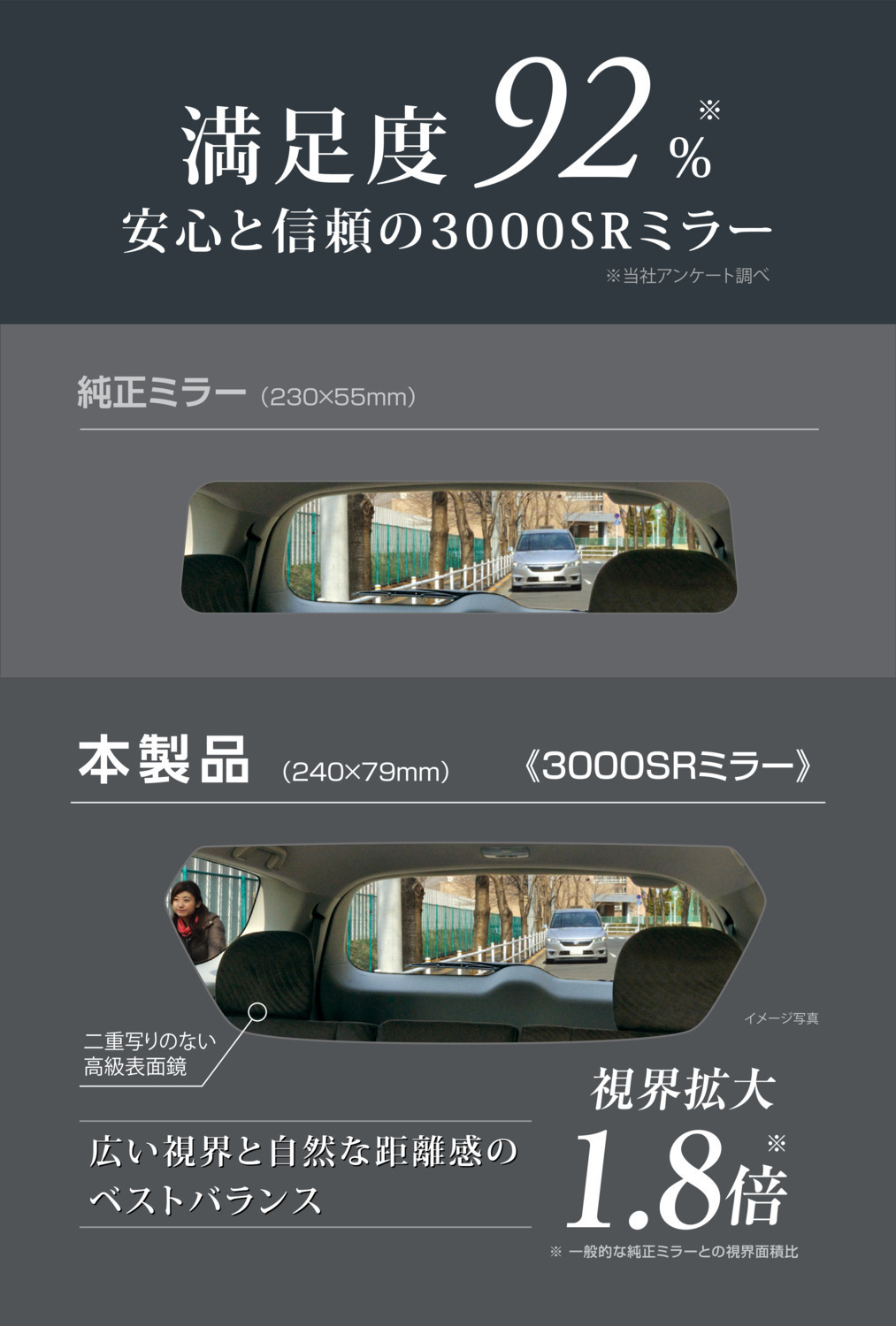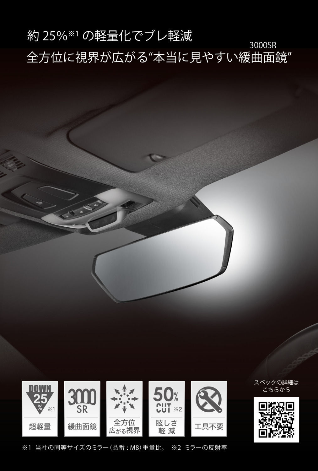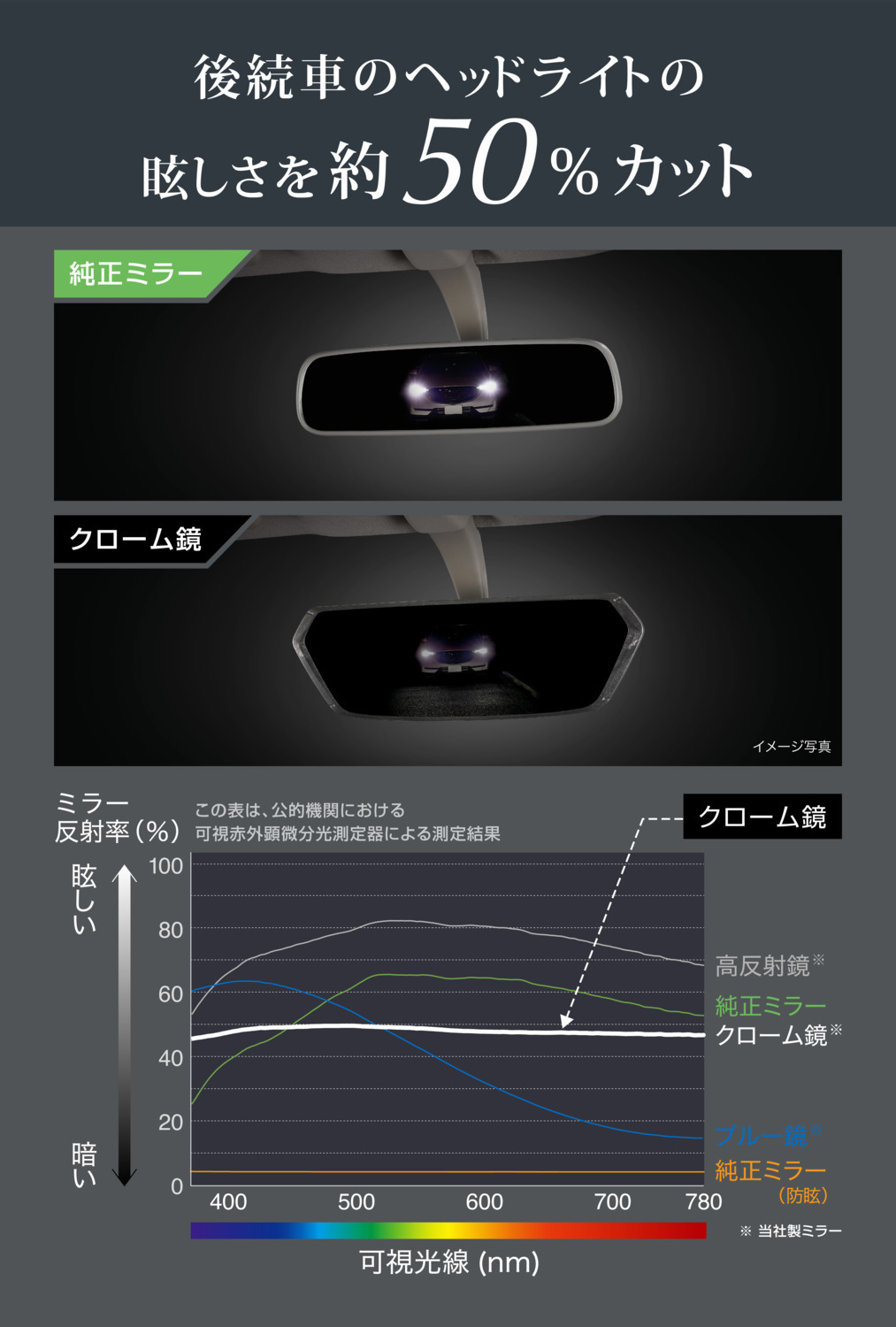 「まぶしい光を約半減。反射率を抑えた高機能ミラー」