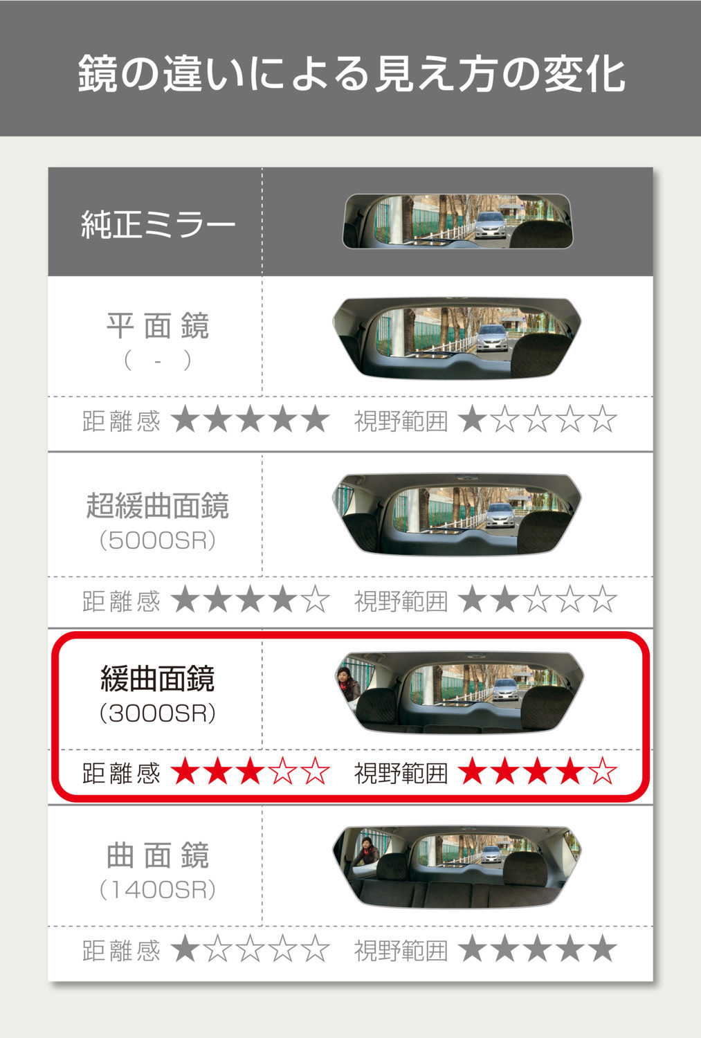 視界はワイドになるが、鏡に映る像が小さくなるため、純正ミラーと比べ距離感の変化が大きい鏡。純正のドアミラーなどミラー面が小さくても広い範囲を映すミラーに採用されています。