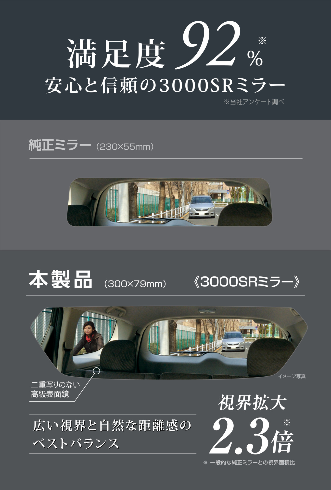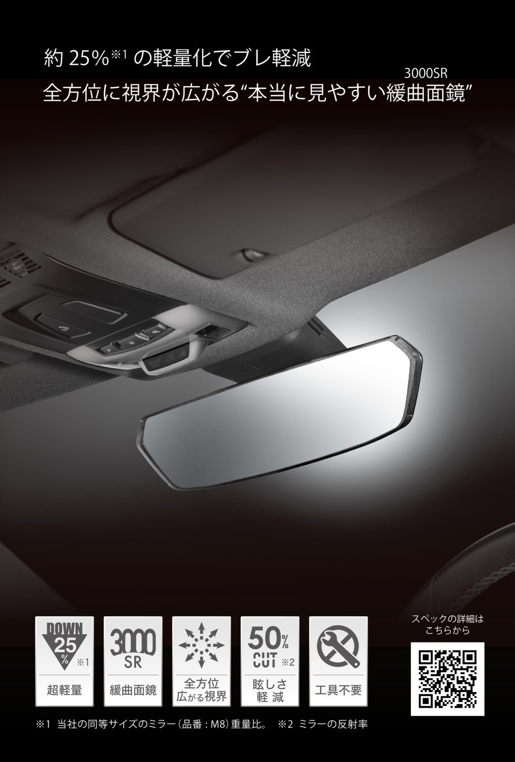 3000SRとは半径3000mmの球面を意味する曲率。その曲面から切り出された緩曲面鏡。平面鏡と比べて広い範囲の光を反射する(映す)ことができるので、一般的な純正バックミラーと比べて視界面積が約2.3倍に広がります。