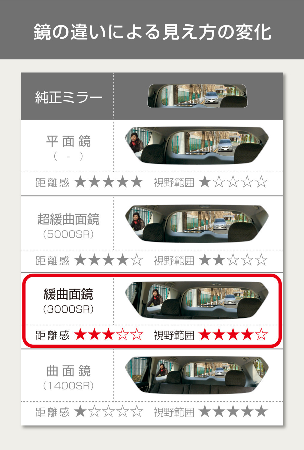 ・超緩曲面鏡(5000SR~4000SR):距離感重視タイプ あまり距離感が変わらないが、多少ワイドにはなる鏡。