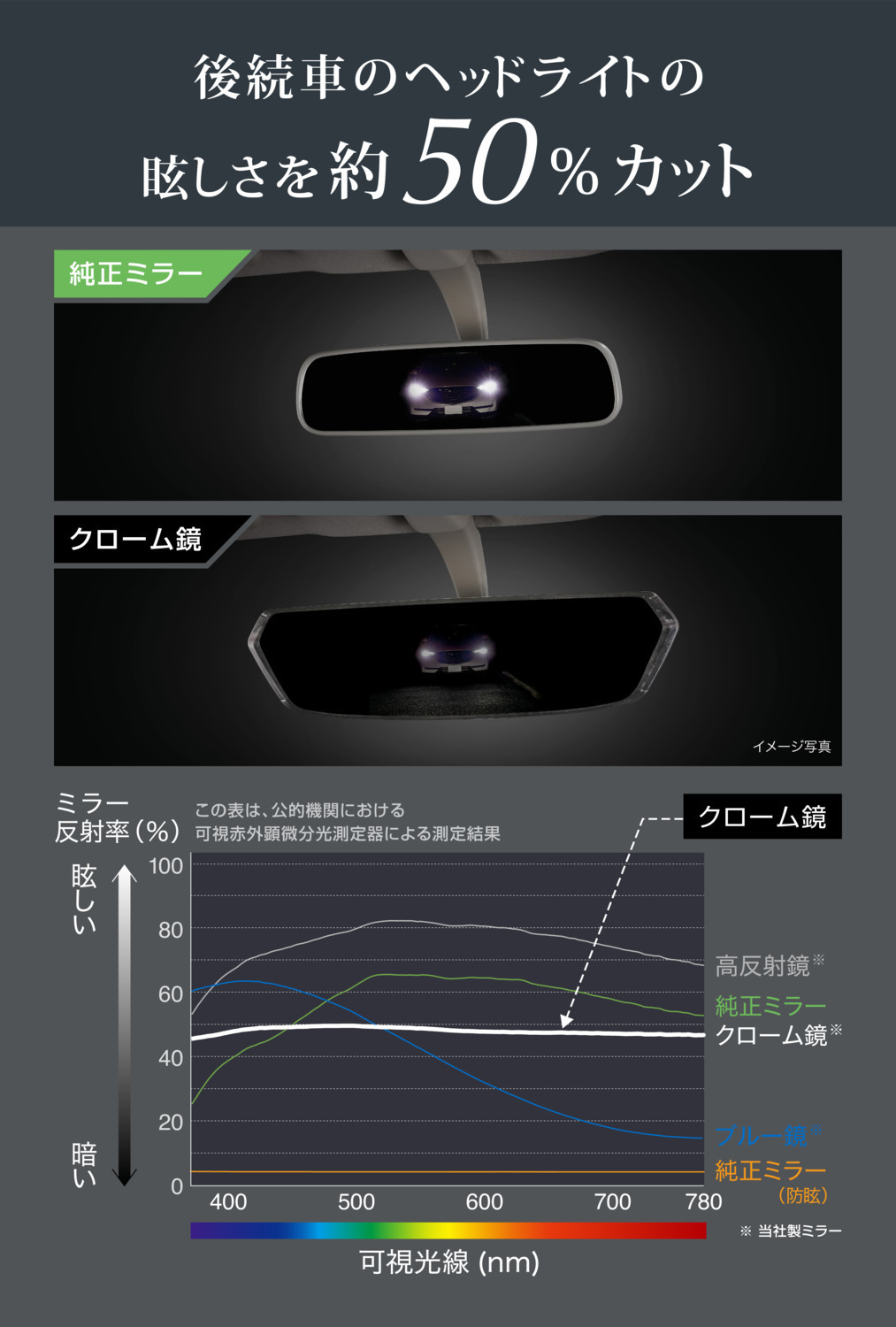 「まぶしい光を約半減。反射率を抑えた高機能ミラー」