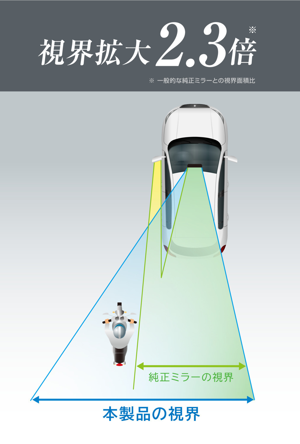 ●本製品は緩曲面鏡のため、純正ミラーとは視界の距離感が異なります。