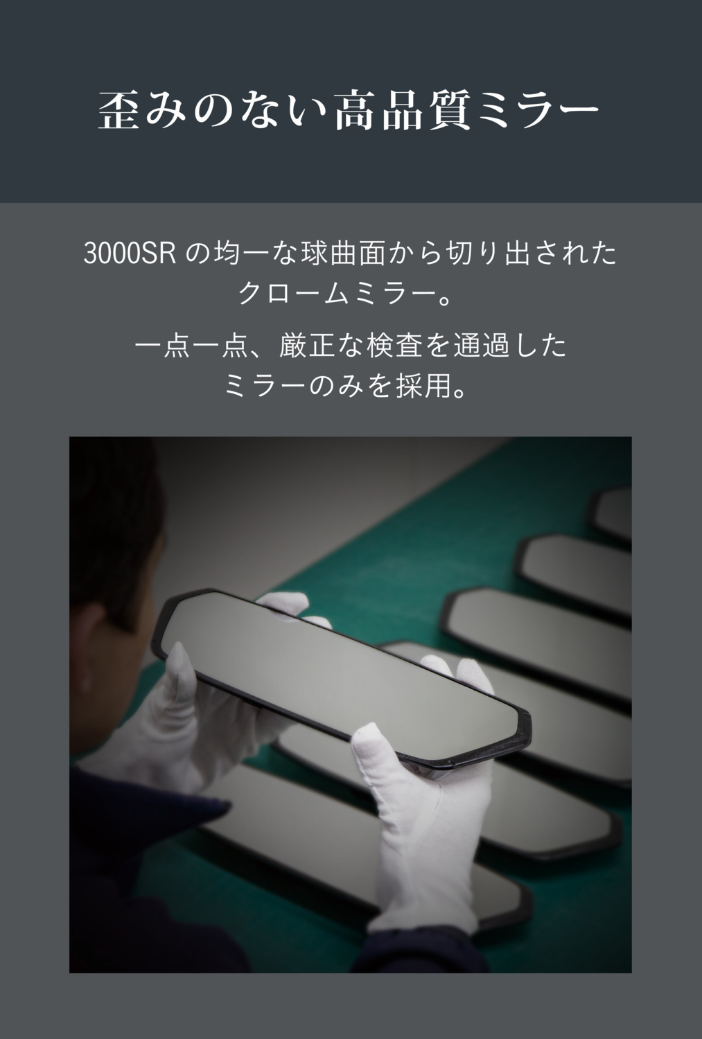 「一点一点、厳正な検査を通過したミラーのみを採用」