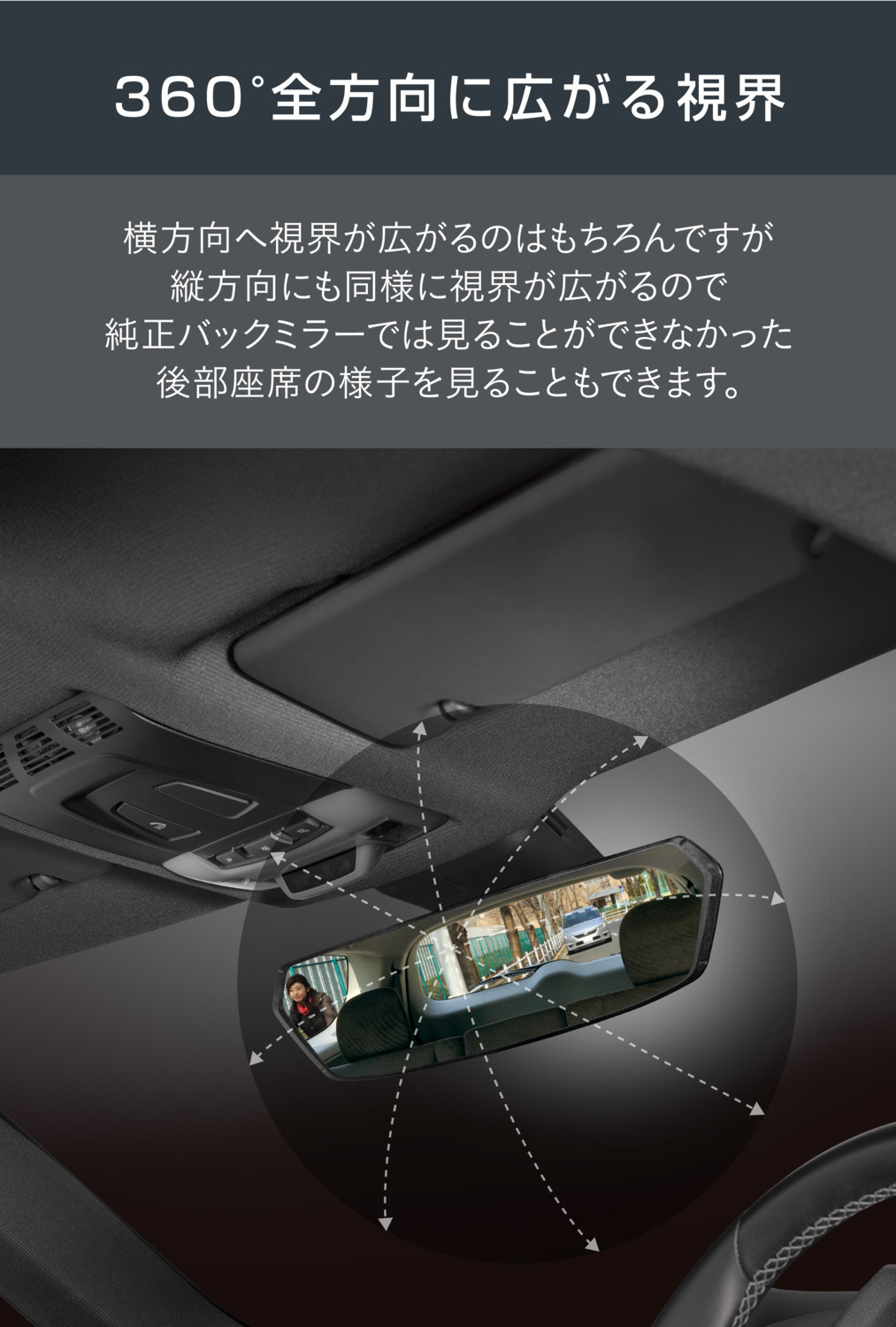 横方向へ視界が広がるのはもちろんですが縦方向にも大きく視界が広がるので、純正バックミラーでは見ることができなかった後部座席の様子が見られて、家族の会話も弾むなんてことも。
