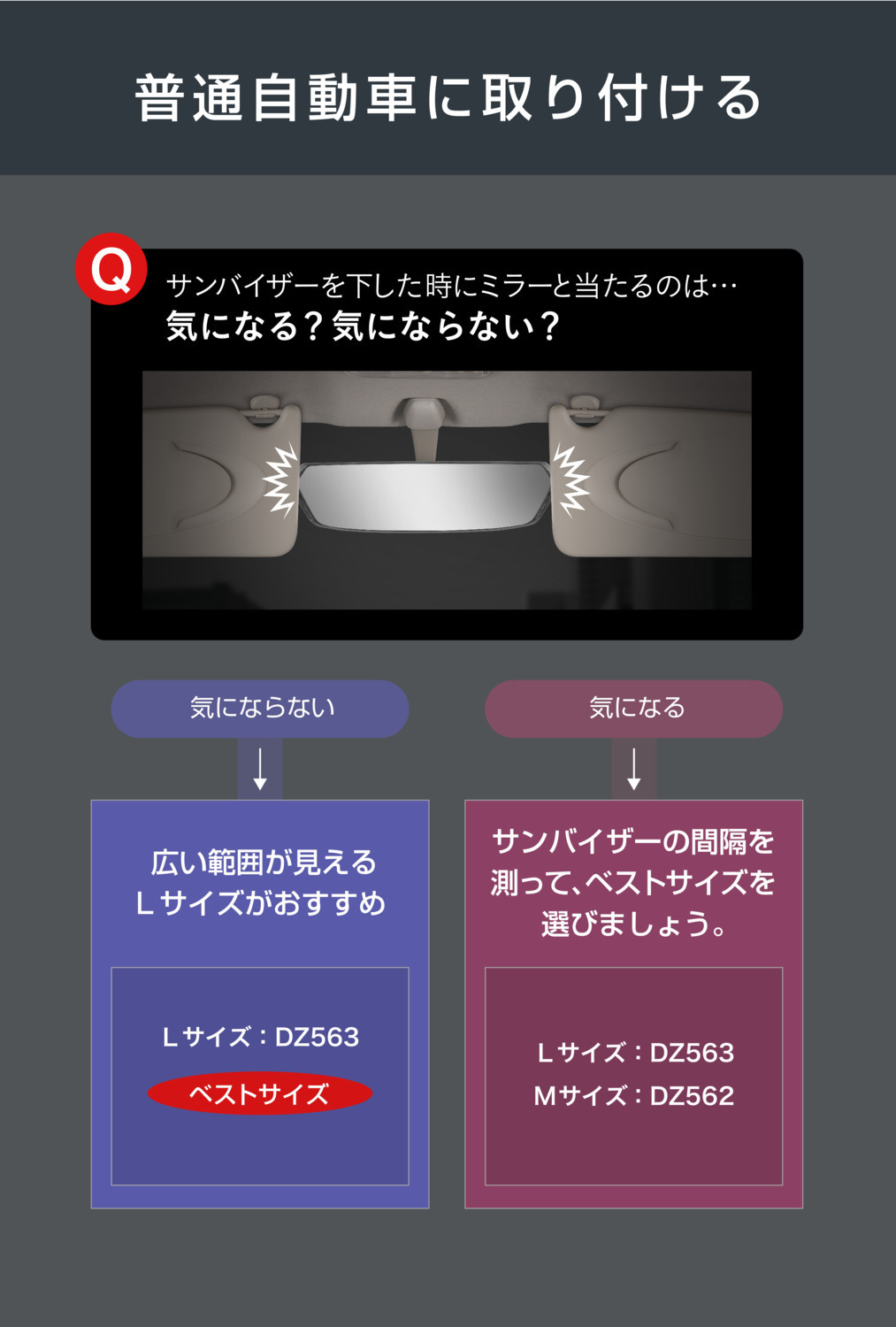・サンバイザーの間隔が【32cm以上】の場合はLサイズ(DZ563)がおすすめです。