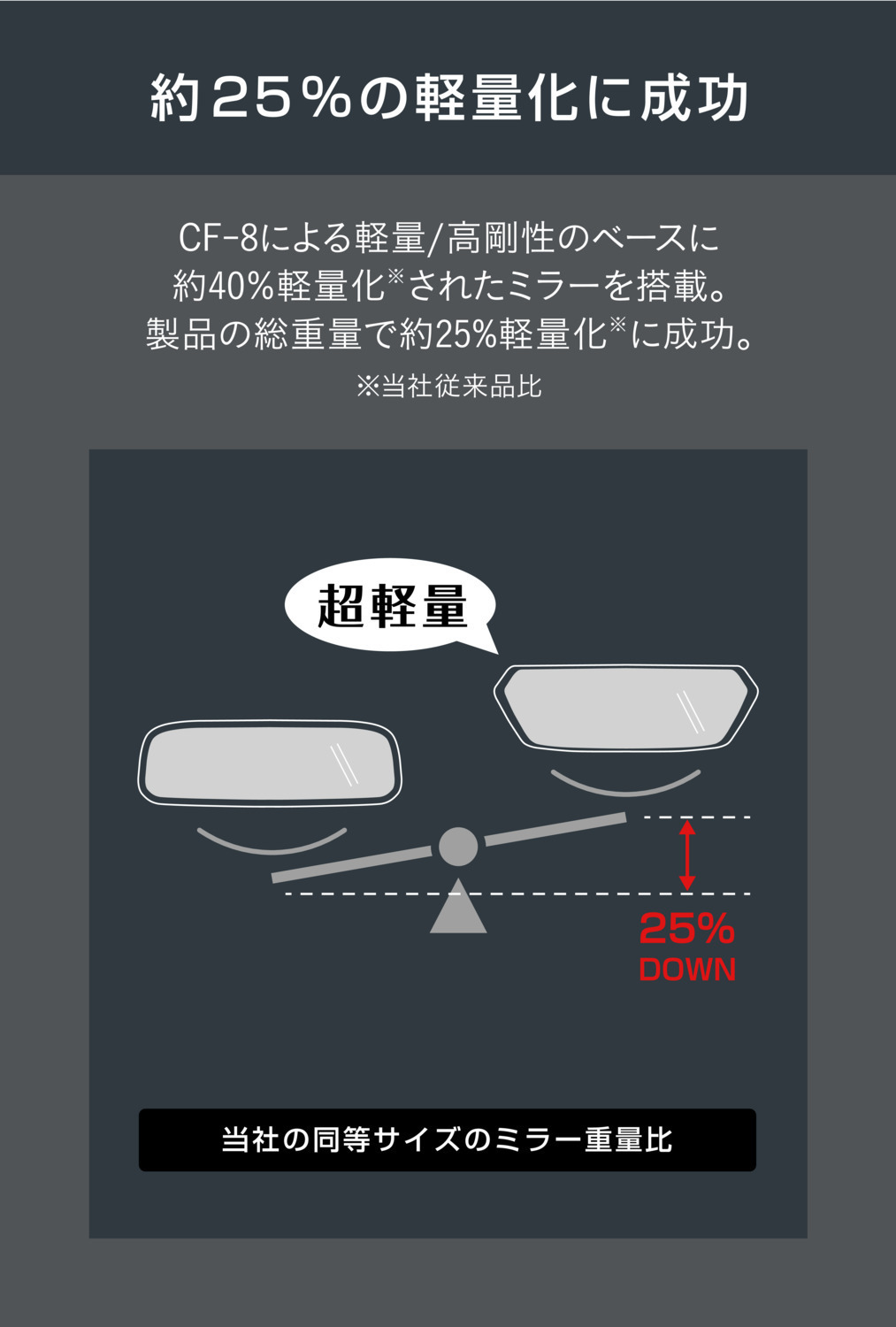 CF-8で軽量高剛性のボディに約40%※軽量化されたミラーを搭載することで、約25%※軽いリヤビューミラーに仕上がりました。