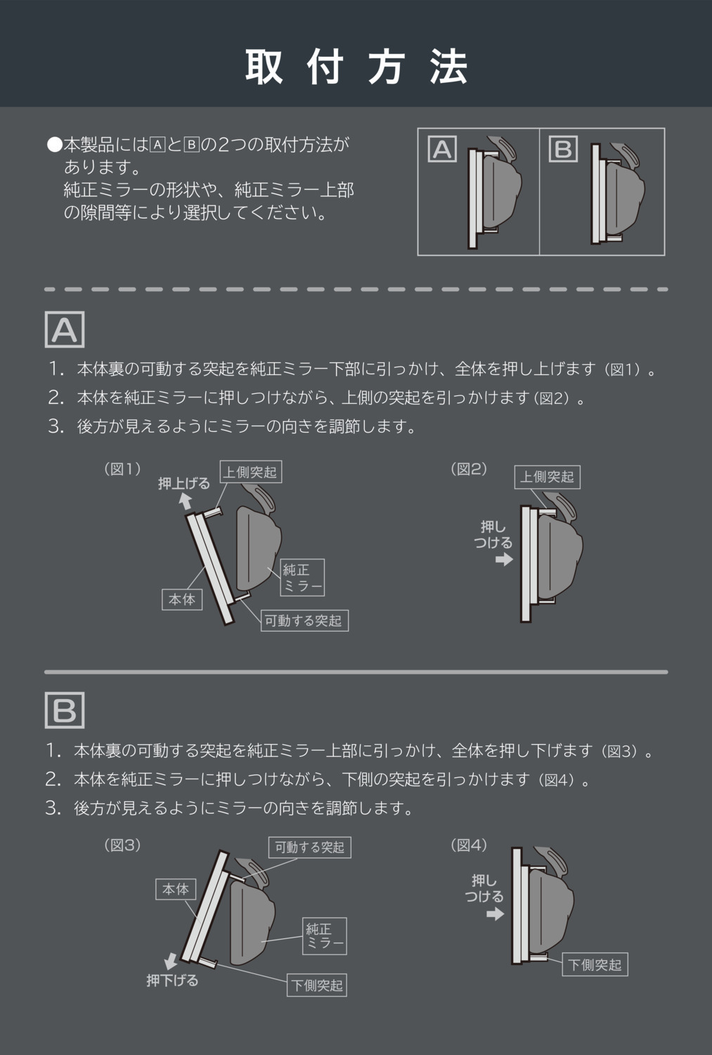 ●本製品を装着すると、純正ミラーの防眩機能やモニター機能は使用できなくなります。