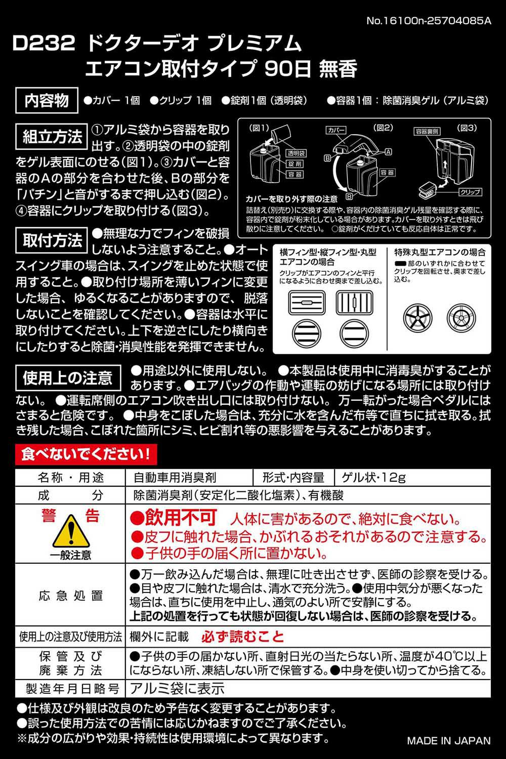 他の画像を見る エアコンの風にのって消臭成分が広がる!消臭効果約90日間持続。 D232 ドクターデオプレミアム エアコン取付タイプ 90日 無香 販売価格 ¥ 1,100 税込 詳細を見る お気に入りに登録する