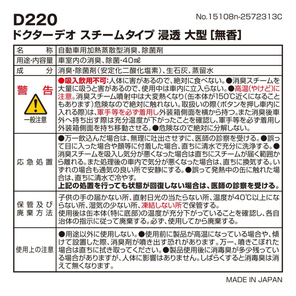 他の画像を見る ”消毒臭”が気になりにくい、メントール配合スチームが誕生!シート・内装を強力消臭! D263 ドクターデオ プレミアム スチームタイプ 浸透 メントール配合 販売価格 ¥ 1,210 税込 ”消毒臭”が気になりにくい、メントール配合スチームが誕生!シート・内装を強力消臭! 詳細を見る お気に入りに登録する