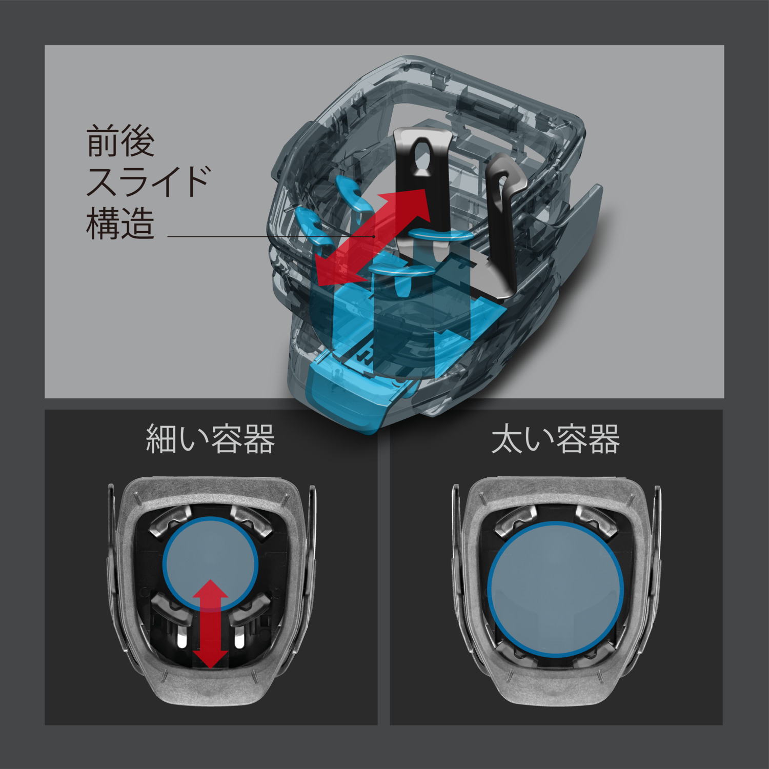 「弾性の動きにスライド機構を加えて。高いホールド性で容器の形状に柔軟に対応」