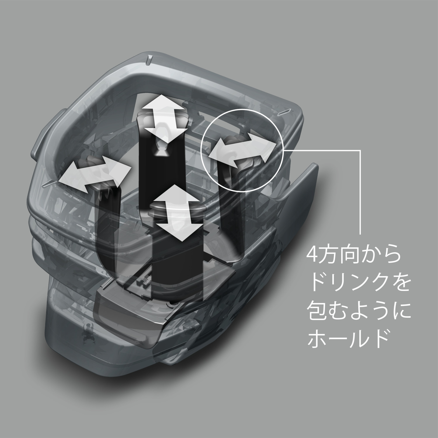 4方向からドリンクを包むように支える構造により