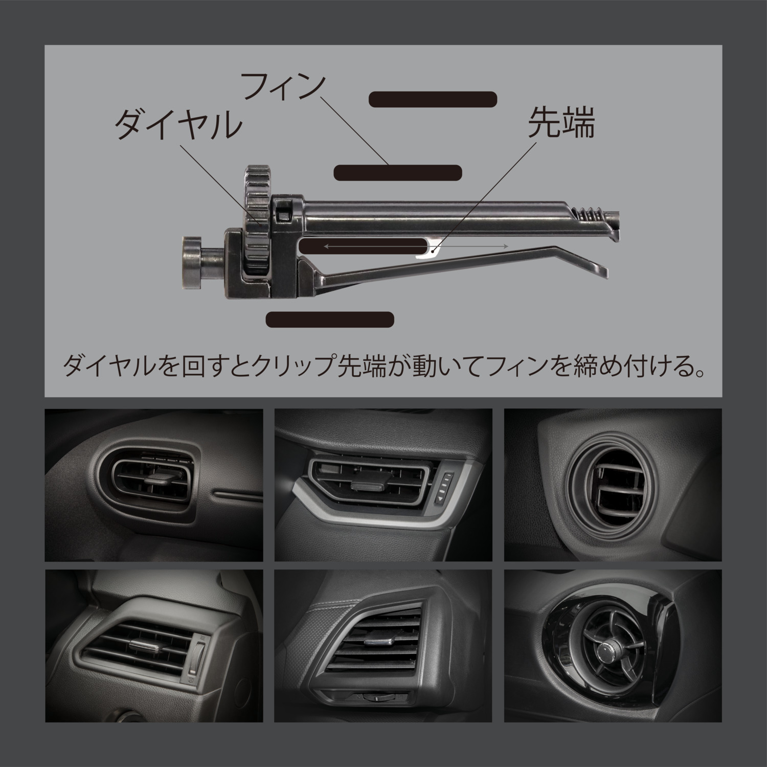 【ネジ式クリップでエアコン吹き出し口に固定】