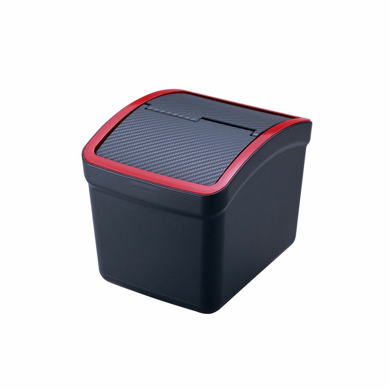フタの部分にはスポーティな見た目のカーボン調デザインを採用しています。フタの縁にはアクセントとしてレッドのラインが施され、車内に洗練されたスタイリッシュな雰囲気を演出します。