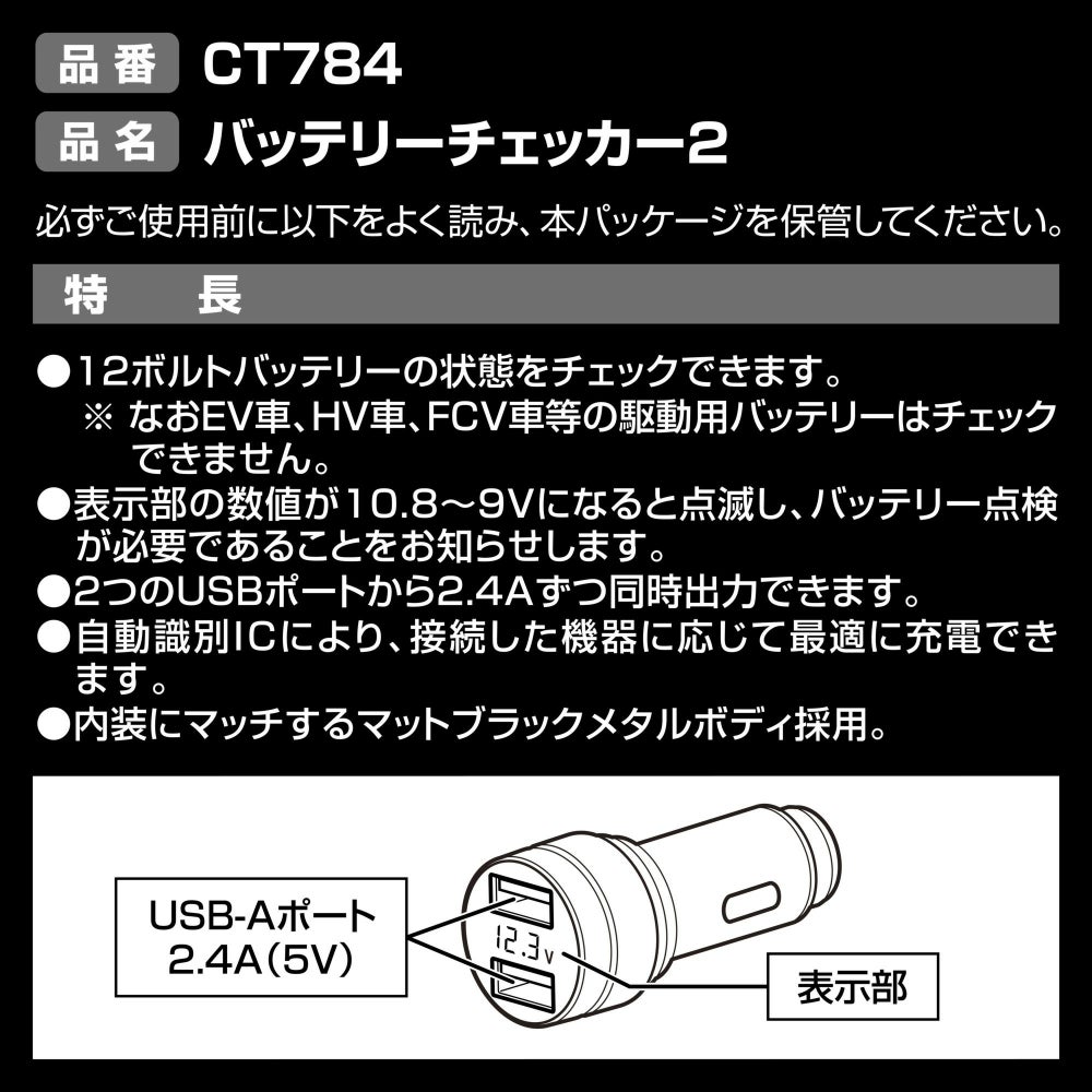 他の画像を見る くるまのバッテリー電圧をリアルタイムにチェック! CT784 バッテリーチェッカー2 販売価格 ¥ 2,480 税込 くるまのバッテリー電圧をリアルタイムにチェック! 詳細を見る お気に入りに登録する