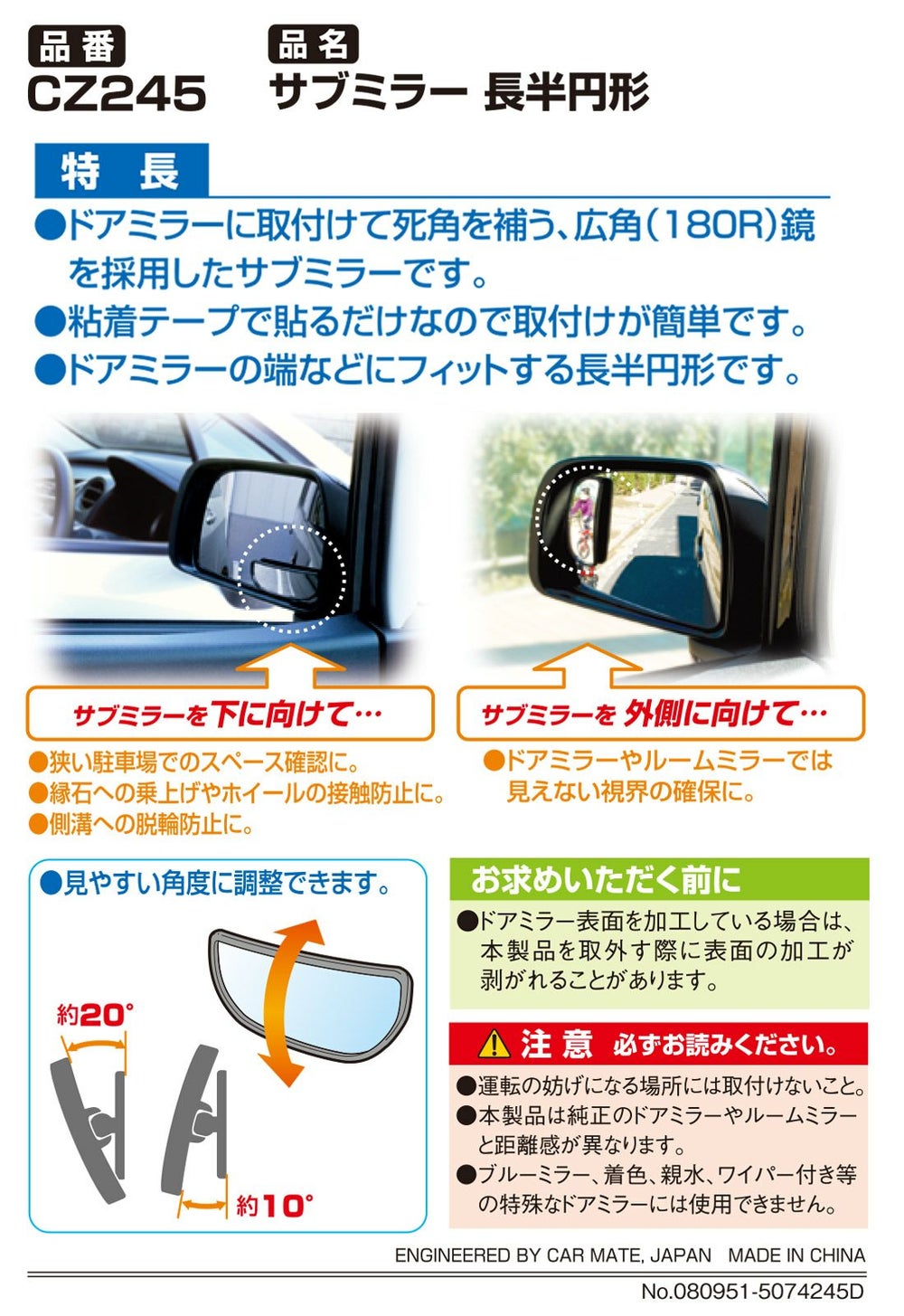 他の画像を見る バックが安心!ドアミラーにフィットする曲面フォルム ワイドな視界の曲面鏡 CZ244 サブミラー 扇形 販売価格 ¥ 1,046 税込 ワク付きだから安心! 詳細を見る お気に入りに登録する