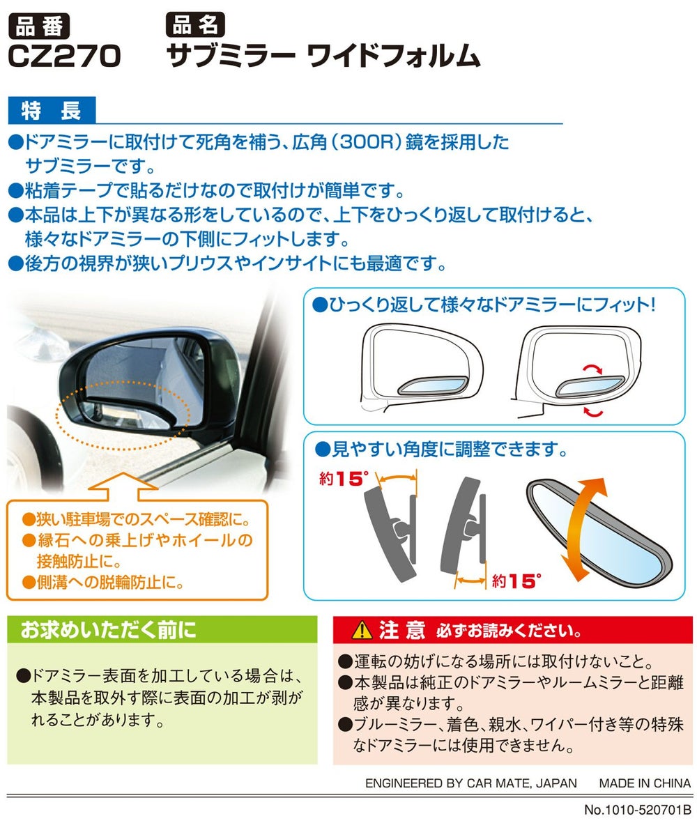 他の画像を見る バックが安心!ドアミラーにフィットする曲面フォルム ワイドな視界の曲面鏡 CZ270 サブミラーワイドフォルム 販売価格 ¥ 1,131 税込 バックが安心!ドアミラーにフィットする曲面フォルム ワイドな視界の曲面鏡 詳細を見る お気に入りに登録する