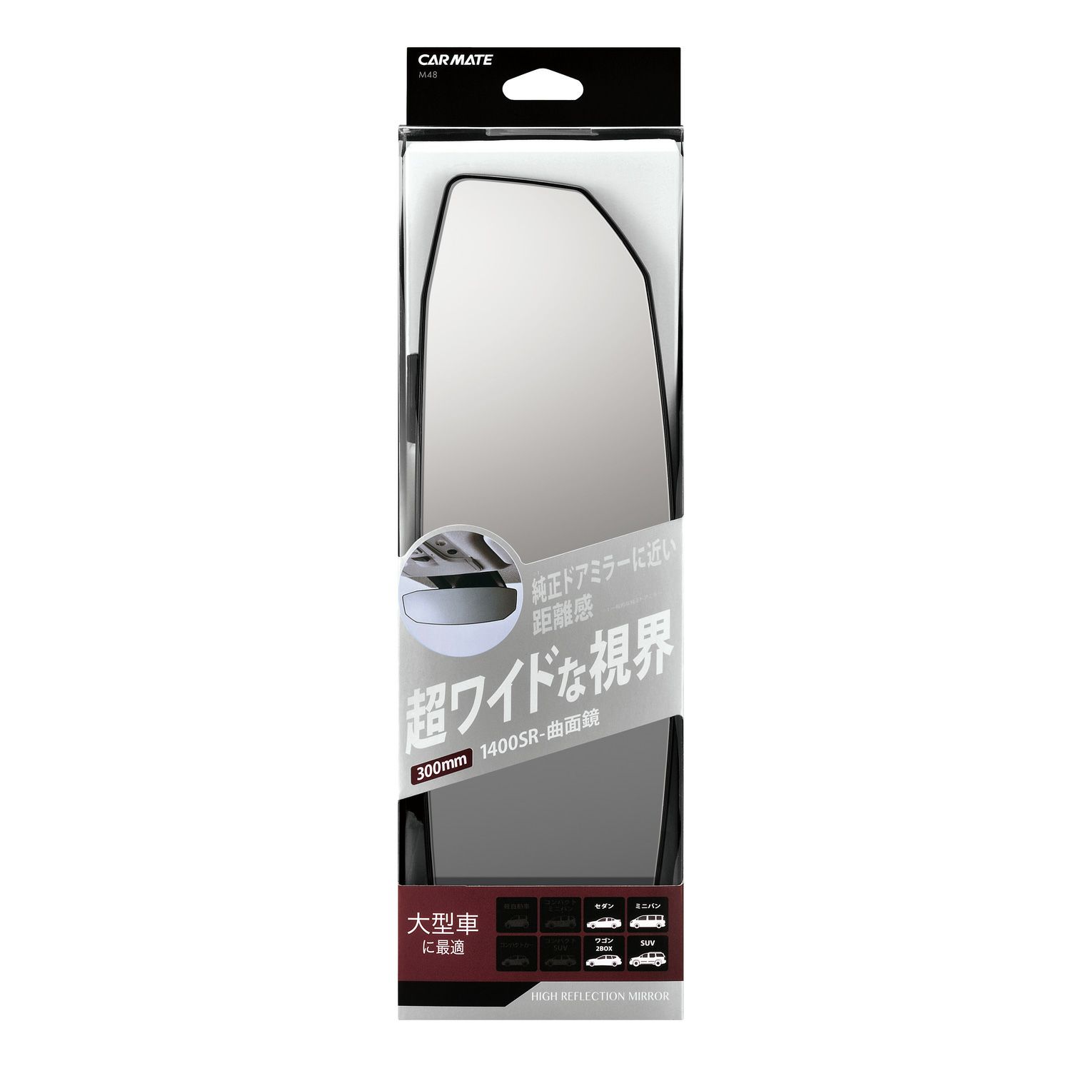 セダン/ワゴン/ミニバン/SUVなどにおすすめのサイズです。製品サイズは横幅305mm高さ95㎜(最大)です。大きいミラーにすれば後方視界が広がるのはもちろんですが、その反面サンバイザーを下ろしたときにミラーと干渉したり、前方視界の妨げに感じる方もいたります。おすすめの車格はサイズを選ぶ際の参考としてみてください。