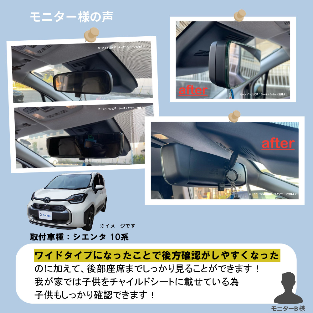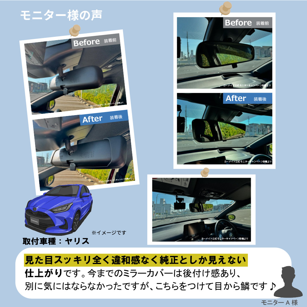 ・本製品は緩曲面鏡のため、純正ルームミラーとは映り方や距離感が異なります。