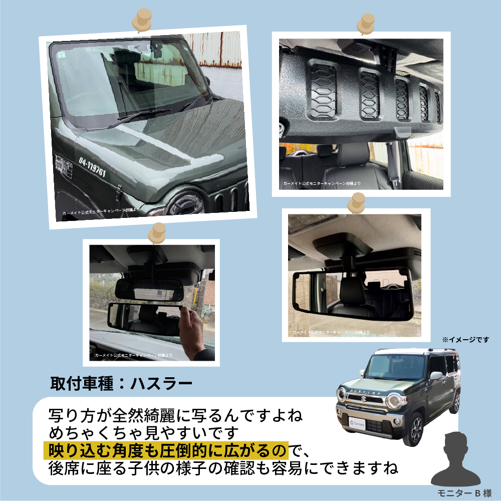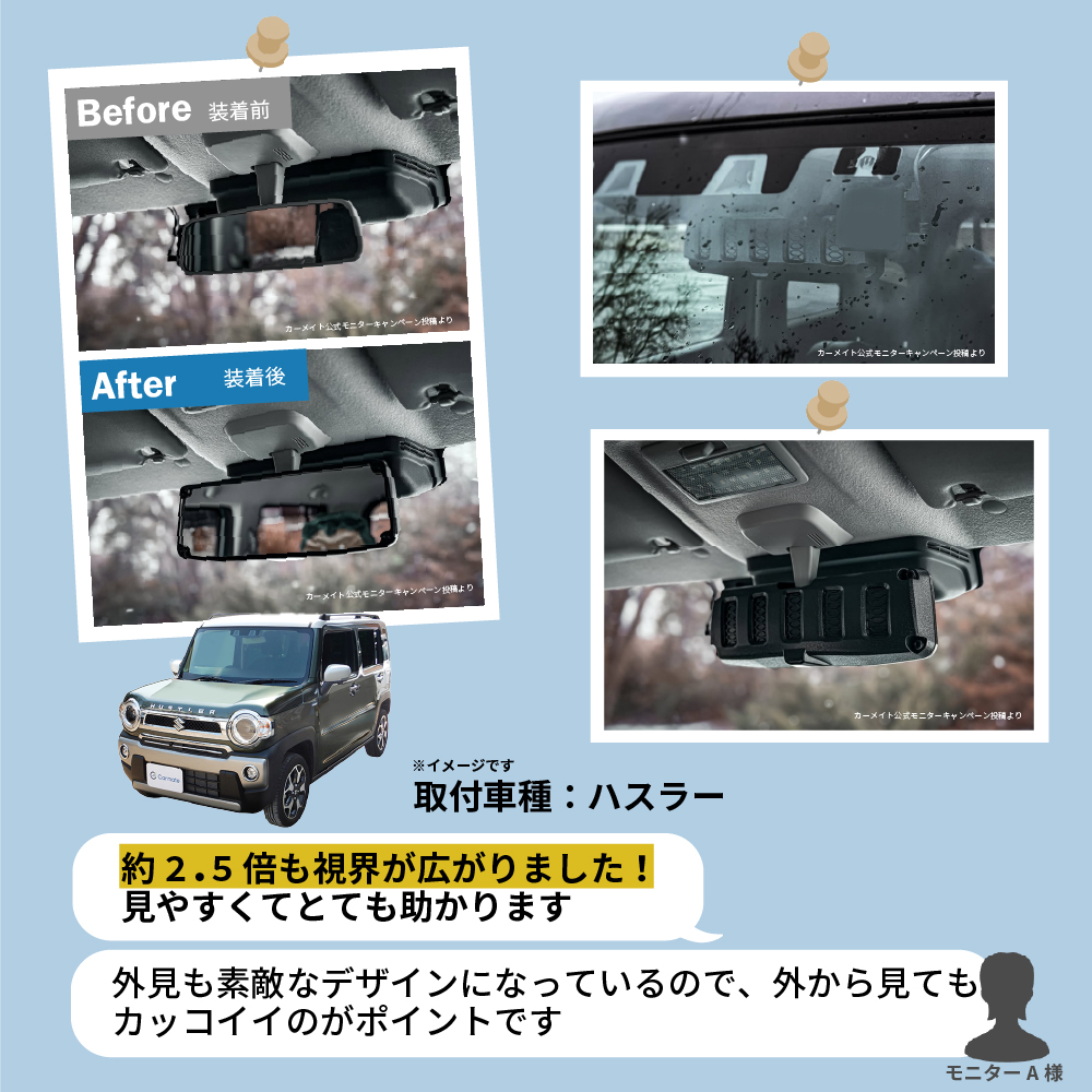 本製品は悪路での揺れや、座りなおした際に変化した姿勢でも後方視界を常に確保できるよう、タテもヨコもサイズアップしています。サンバイザー使用時でもサンバイザーに干渉しない範囲で、純正ミラーではクルマの揺れで見えなくなる後方視界を常に確保できるように、なるべくミラーサイズを大きなサイズにしていますので、後方が確認できなくなる不安やストレスを低減させます。また、後方側面の窓も映すことができるので、車線変更時の安全性運転もサポートしてくれます。