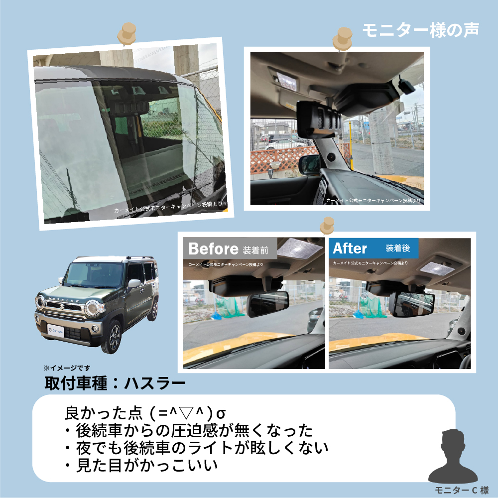 ※走行中やアイドリング中にミラーがブレる場合、純正ミラー背面のネジを締めることで改善する可能性があります。本製品を取り付けた上で装着するカバーも被せるだけで装着可能なので、本製品を装着する時間は3分もかかりません。