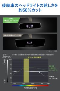 夜間、後続車のヘッドライトの眩しさを約50%カットするクローム鏡。