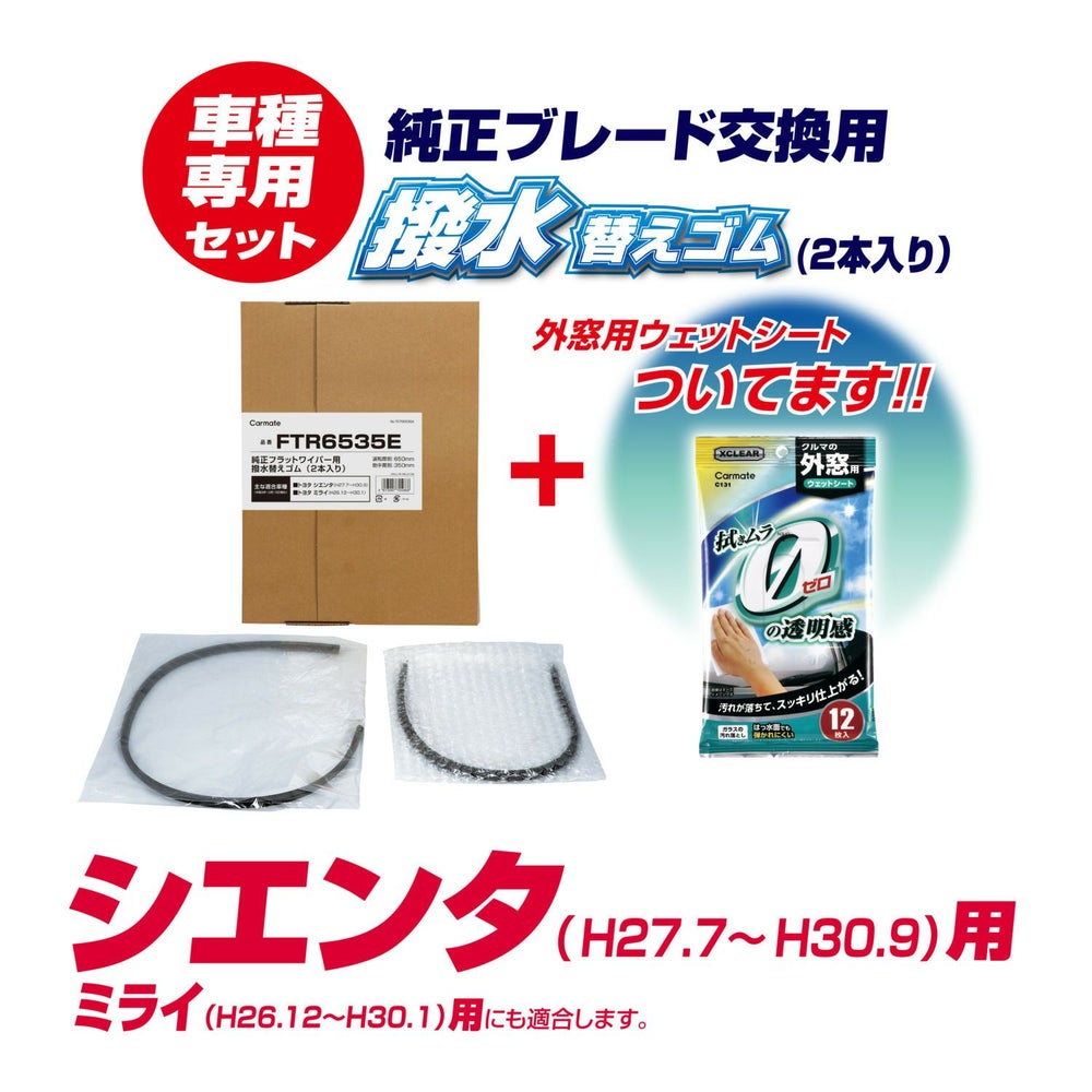他の画像を見る 車種別専用品、更に運転席側・助手席側の2本セットなのでお求めやすいです FTR6535E 純正フラットワイパー用撥水替えゴム車種別セット(シエンタ) WEB限定品 販売価格 ¥ 2,695 税込 外窓用ウェットシート(品番:C131)の付録が便利なWEB限定品です 詳細を見る お気に入りに登録する