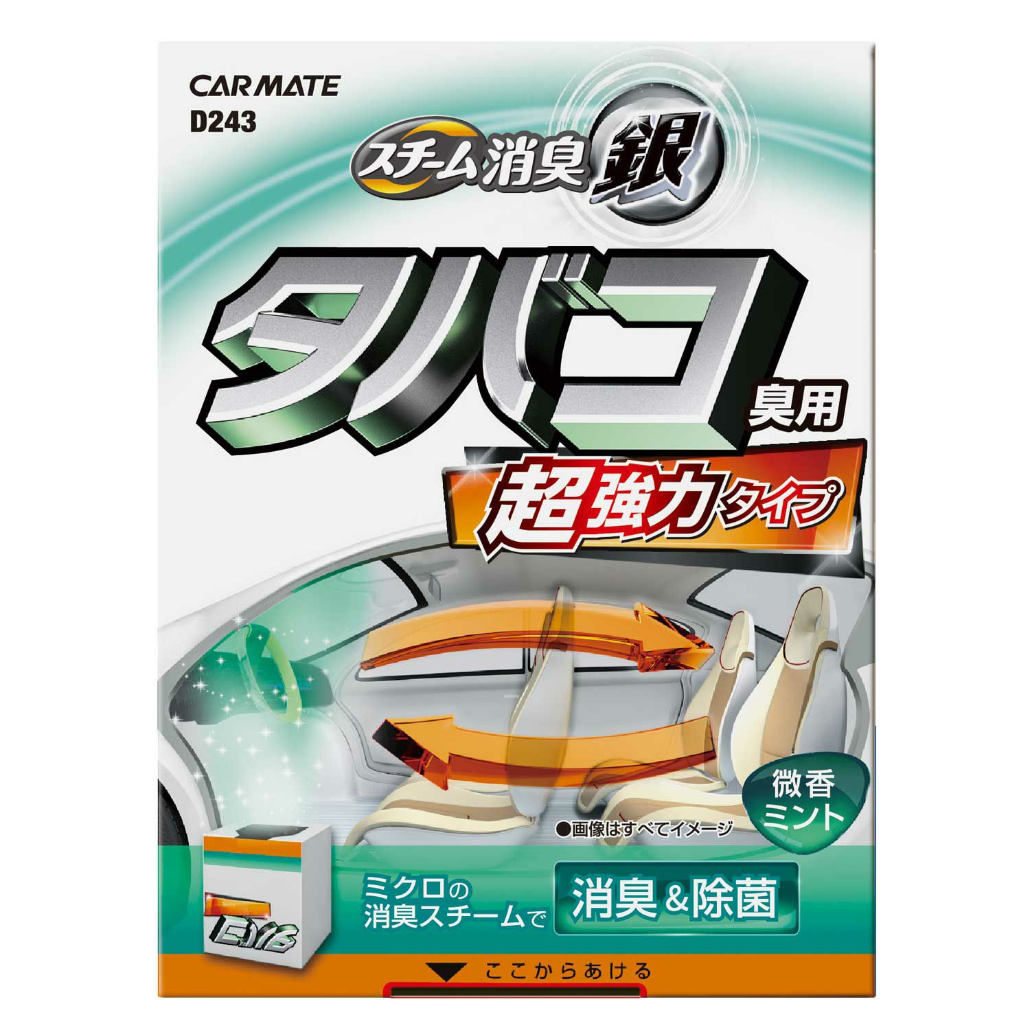 従来品に比べ消臭効果1.5倍。消臭スチームが車内のニオイ&エアコンの内部まで強力消臭。消臭成分は病院やレストランの業務用としても使われている「安定化二酸化塩素」&「銀イオン」採用。安心&安全設計。作業もカンタン、PUSHボタンを押すだけ。タバコ臭と相性の良いミントの香り。