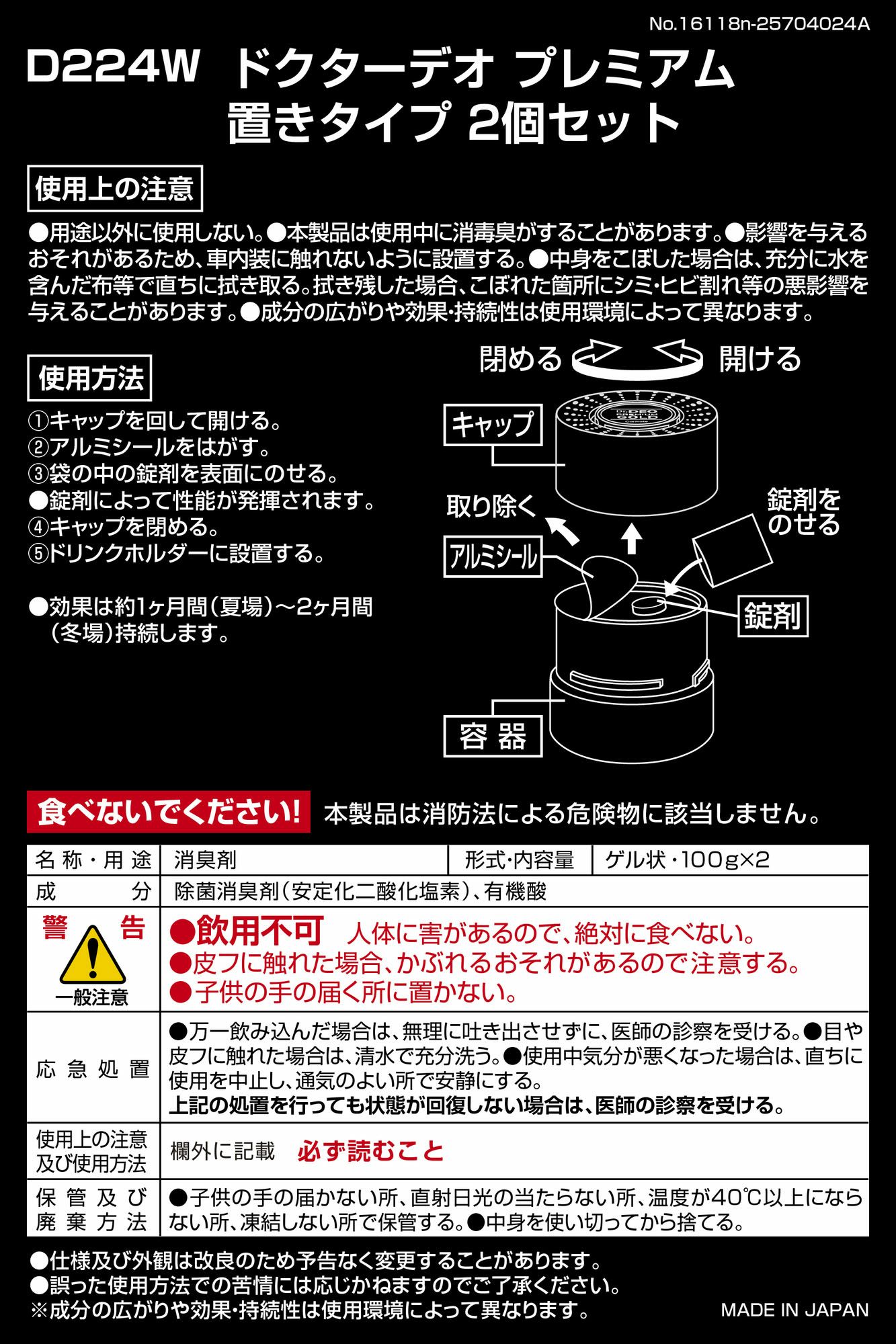 他の画像を見る ベーシックタイプ比較200%の消臭性能を実現。 ドリンクホルダーにピッタリサイズで、車内に置くだけで悪臭成分を酸化分解し強力消臭。D224のお買い得2個セット。 D224W ドクターデオプレミアム 置きタイプ 2個セット 販売価格 ¥ 1,304 税込 詳細を見る お気に入りに登録する