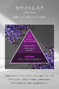 洗練されたホワイトフローラルをベースに、心地よいフルーツがアクセントとなり、上質なムスクが優しく全体を包み込みます。