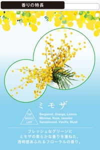 フレッシュなグリーンにミモザの柔らかな香りを重ねた、透明感あふれるフローラルの香り。