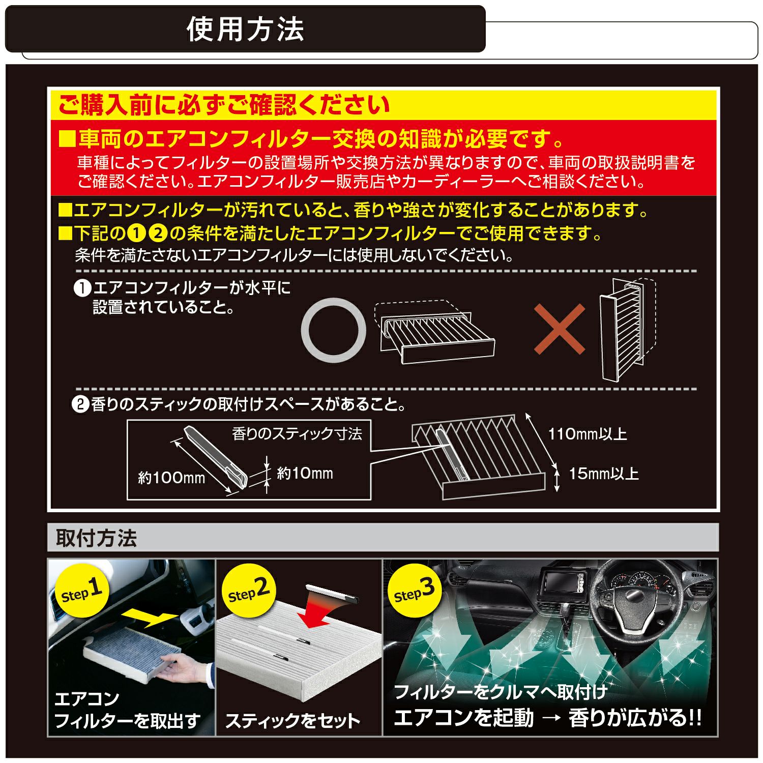 本製品は、クルマのエアコンフィルターへセットする、新感覚のクルマ用芳香剤です。