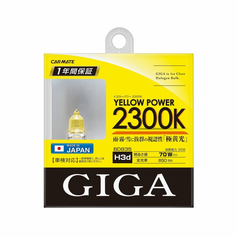 車検対応発光色で「最も濃いイエロー光」を照射する色温度2300Kの『極黄光』。明るく、力強い『極黄光』が、雨・霧・雪などの悪天候時にも抜群の視認性を確保。自社新製法により更なるロングライフ化を実現。安心の1年間保証付き。フォグランプに最適なハロゲンバルブです。色温度:2300K 明るさ感:70Wクラス 全光束(明るさ):850lm