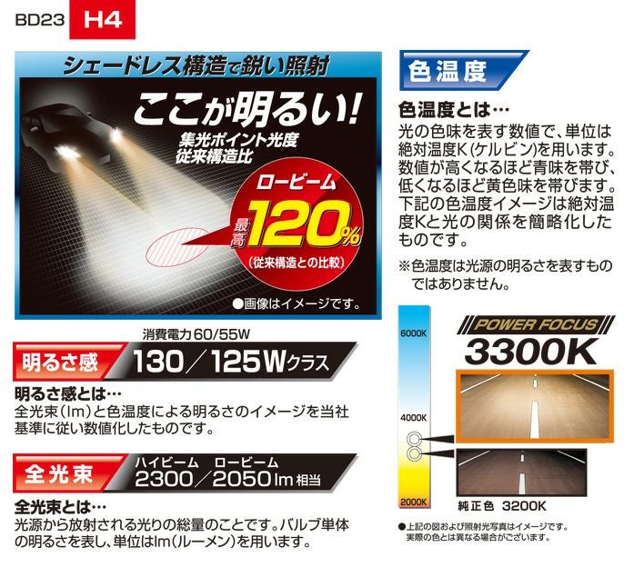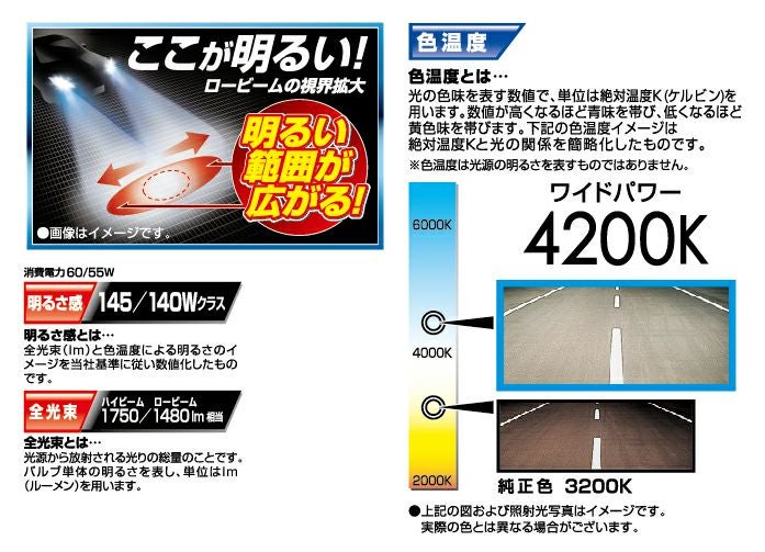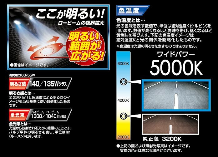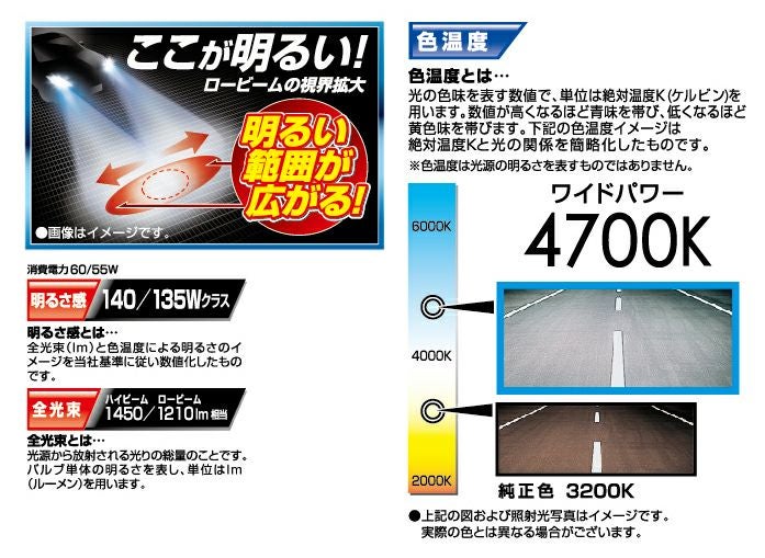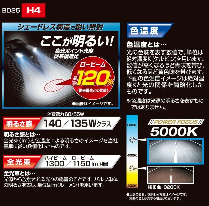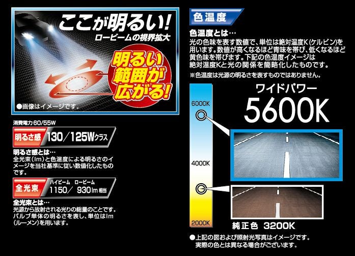 ※ 車両状態および灯具の損傷、劣化などの影響で、バルブの性能(明るさ・発光色)を十分発揮できない場合があります。