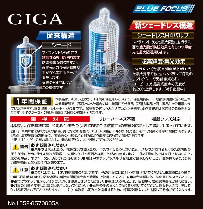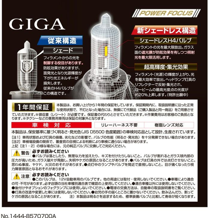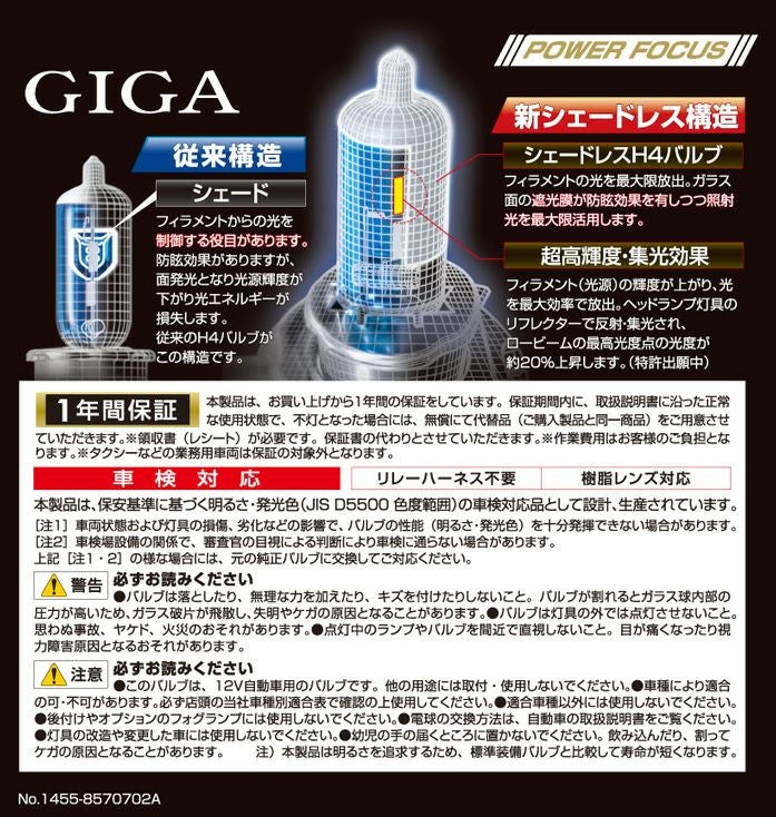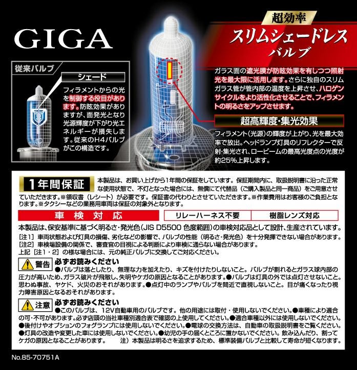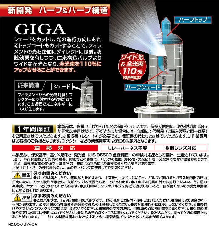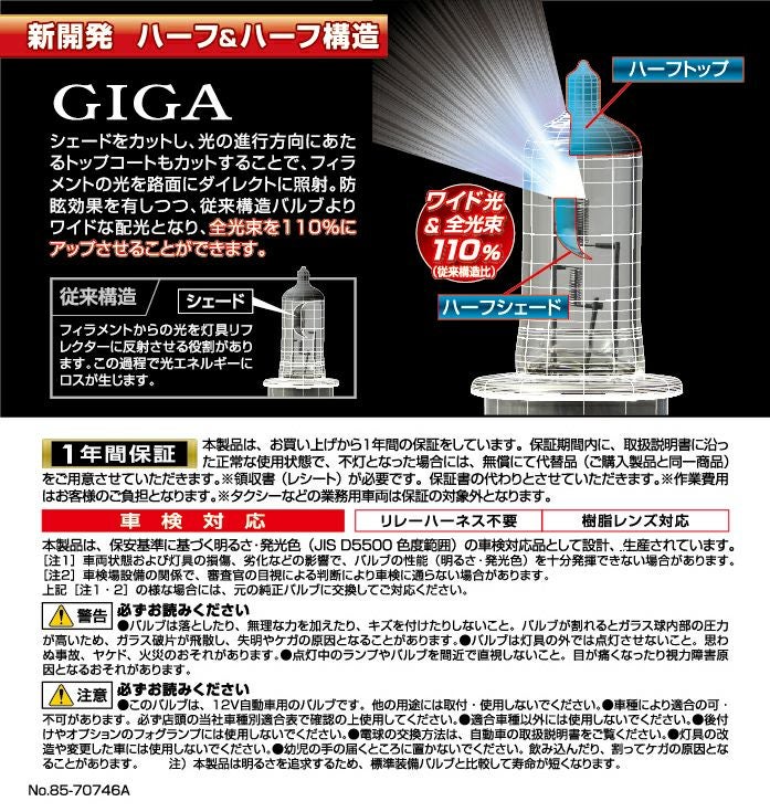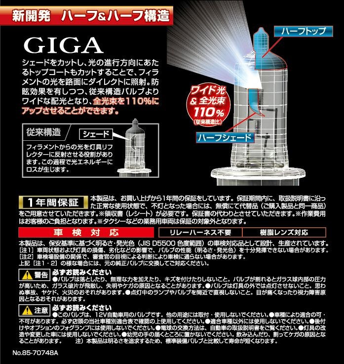 GIGA独自のシェードレス構造と高品質クリスタルガラス採用の新型スリム管が高次元で融合! 寿命を犠牲にせずにロービーム集光ポイントの光度 従来構造比125%の鋭い照射光を実現したGIGAシリーズの最高傑作。車検対応、安心の「1年間保証」付き。