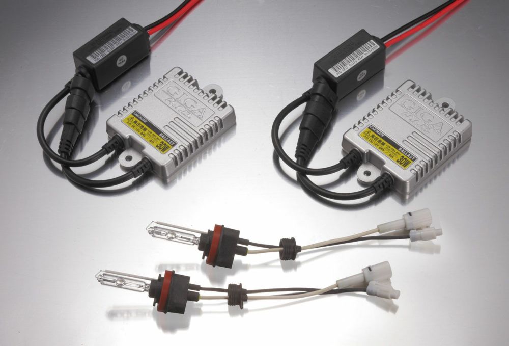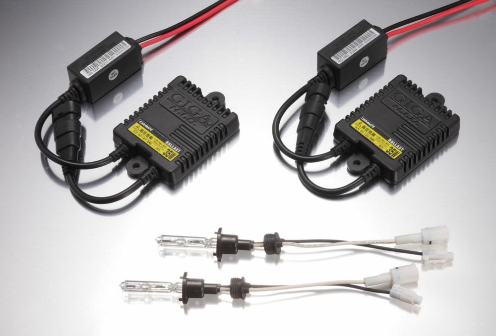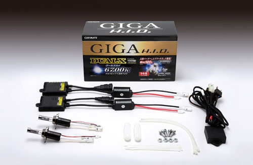 「DUALX」とは、明るさと耐久性向上のために「極太アウターガラス管」と「レアアース配合メタルハライド」を採用した、GIGA独自形状の高性能H.I.D.シリーズ。 「ヘッドランプ専用DUALX 35W コンバージョンキット」は、DUALX H4バーナーと35Wバラスト、リレーハーネスがワンパッケージになったオールインワンセット。 純正ハロゲンバルブから変更することで、夜間走行時の視認性・快適性が大幅に向上します。