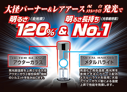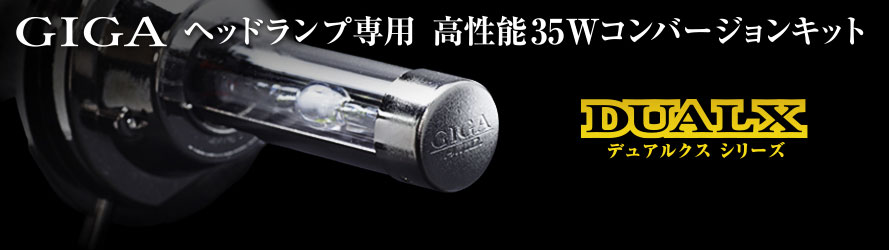「DUALX」とは、明るさと耐久性向上のために「極太アウターガラス管」と「レアアース配合メタルハライド」を採用した、GIGA独自形状の高性能H.I.D.シリーズ。