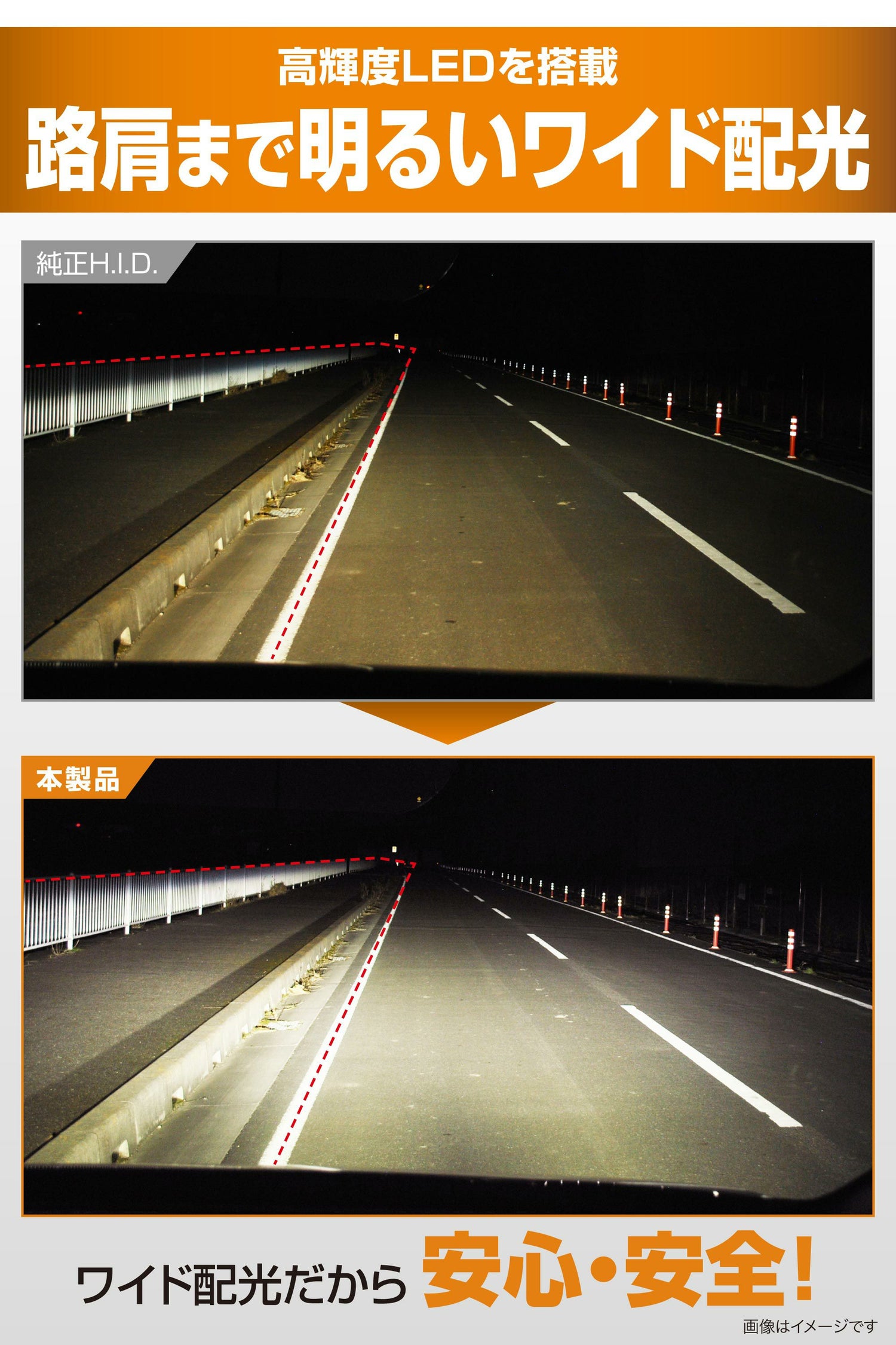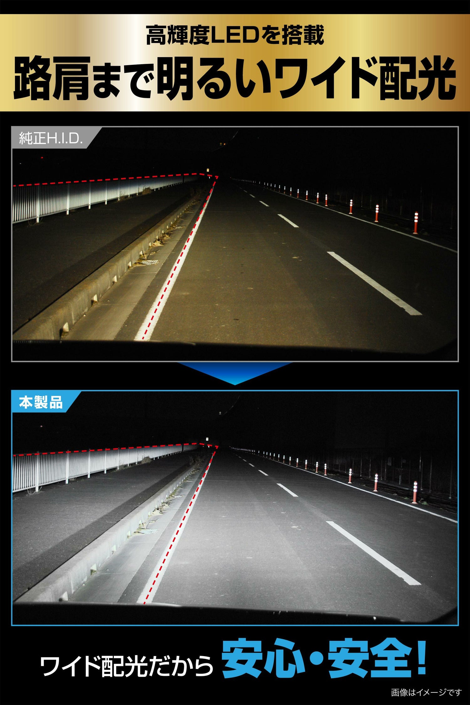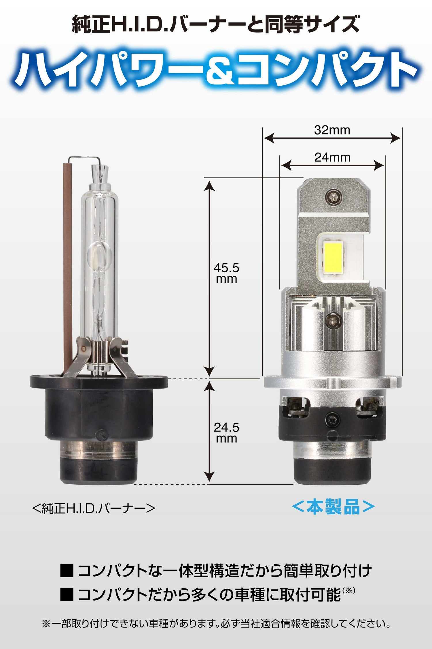 最新の高輝度LEDを2個搭載。H.I.D.を簡単により明るくしたい人に最適な製品です。