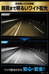 本製品は照射範囲の広い高輝度LEDを採用。このLEDのレイアウトを徹底的にチューニングすることで、H.I.D.に対して横方向に広いワイド配光を実現。路肩がより見やすくなることで、歩行者や自転車が発見しやすくなり安心してドライブすることができます。