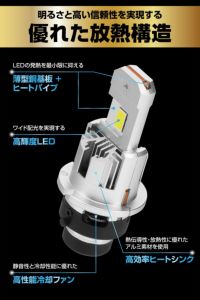 LEDヘッドバルブは長時間点灯させるとLEDが発する熱により明るさが落ちていきます。本製品は銅基板、ヒートパイプ、冷却ファン、高効率アルミヒートシンクなどの最新の放熱技術を採用。コンパクトな一体型構造ながらLEDの発熱を抑え、明るさの低下を最小限に抑えます。