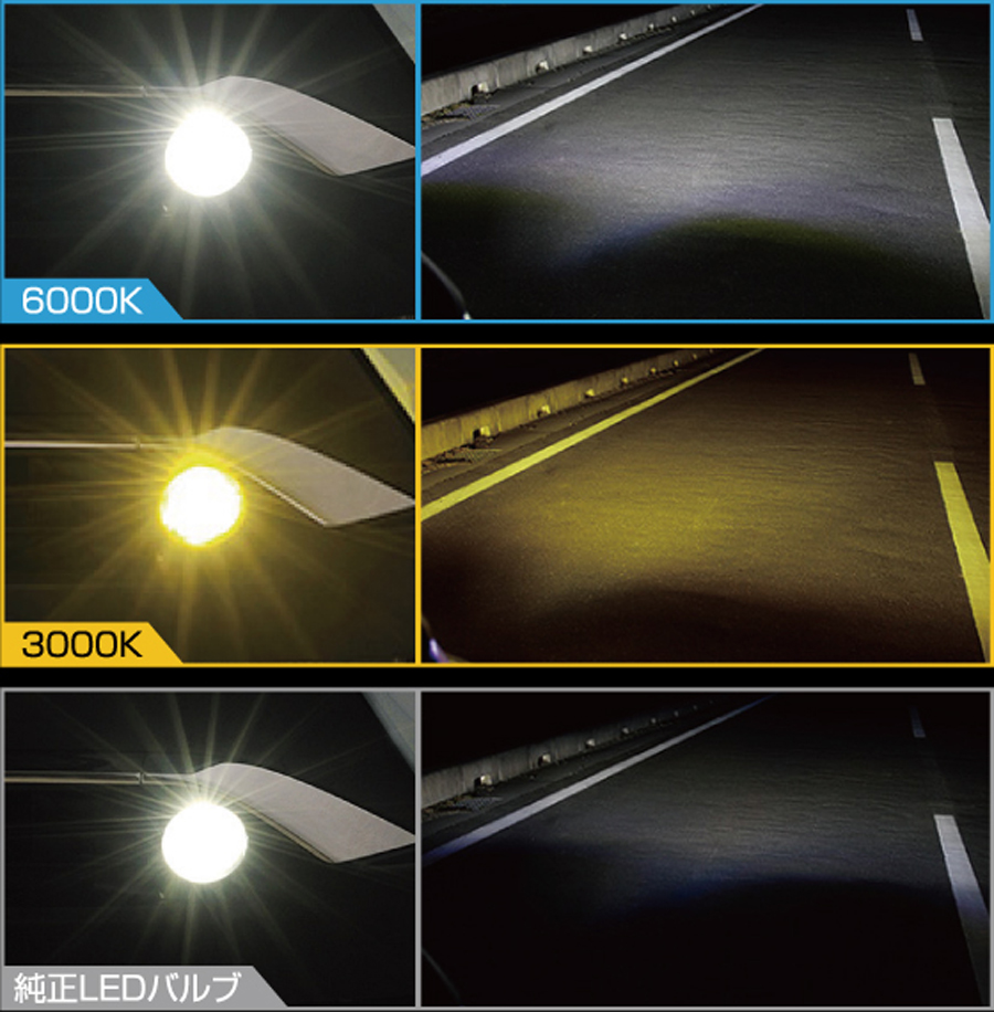発光色は6000Kの白色光と3000Kのイエロー光の2種類をラインナップ。青味のない6000Kの白色光は、あらゆるシーンで見やすさを発揮します。純正LEDヘッドライトの発光色にも近いので見た目の相性も抜群。 実用性とルックスを両立させた定番の発光色です。 3000Kのイエロー光は、夜間の雨、雪、霧などの悪天候時での見やすさが大幅にアップします。 また、 キャンプなどのアウトドアシーンや、 人気のSUV車にもマッチします。 昔から根強い人気の発光色です。