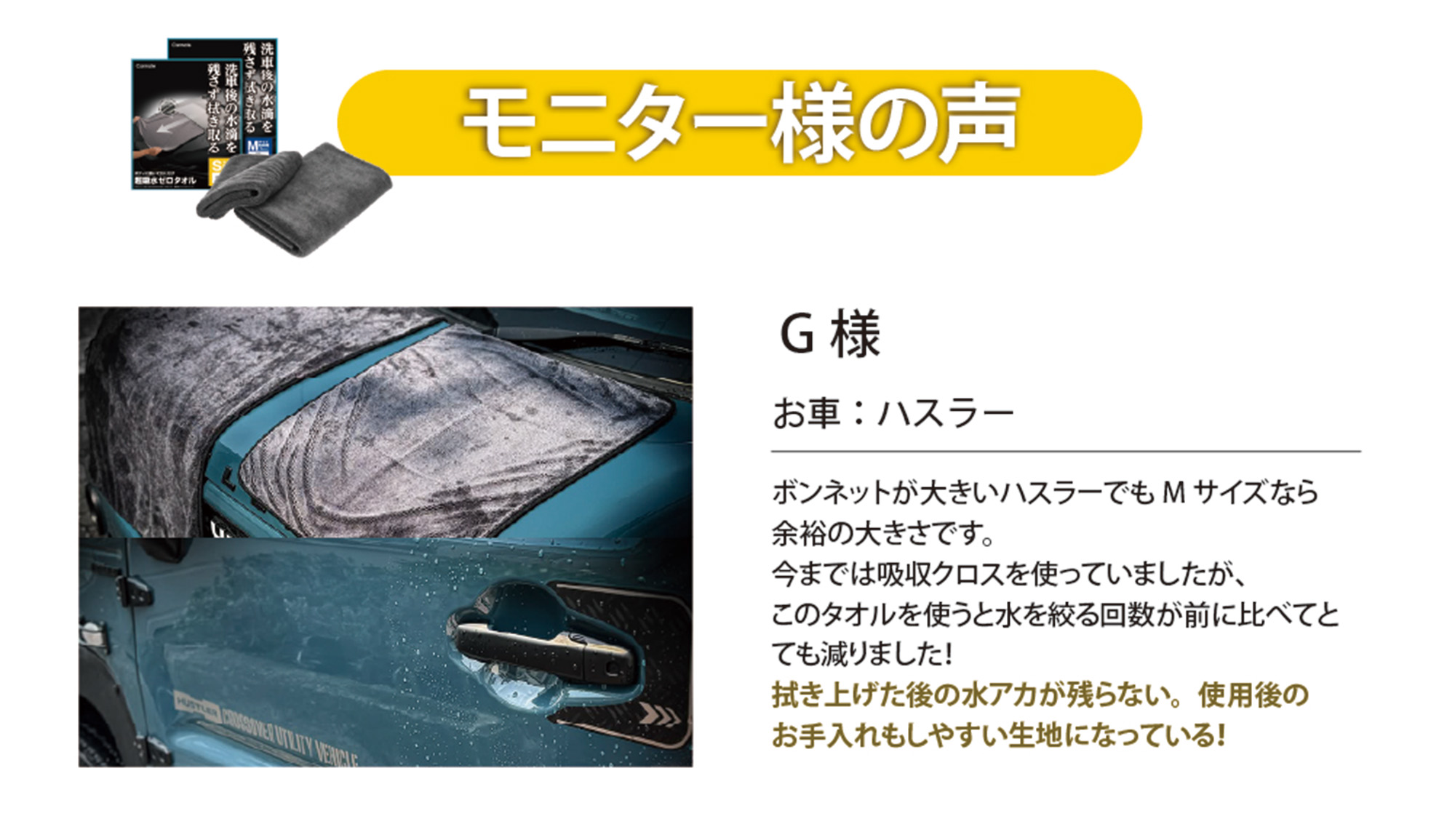 吸水性が非常に良い為、何度も絞る必要なく車体についた水分を拭き上げることが出来ました!