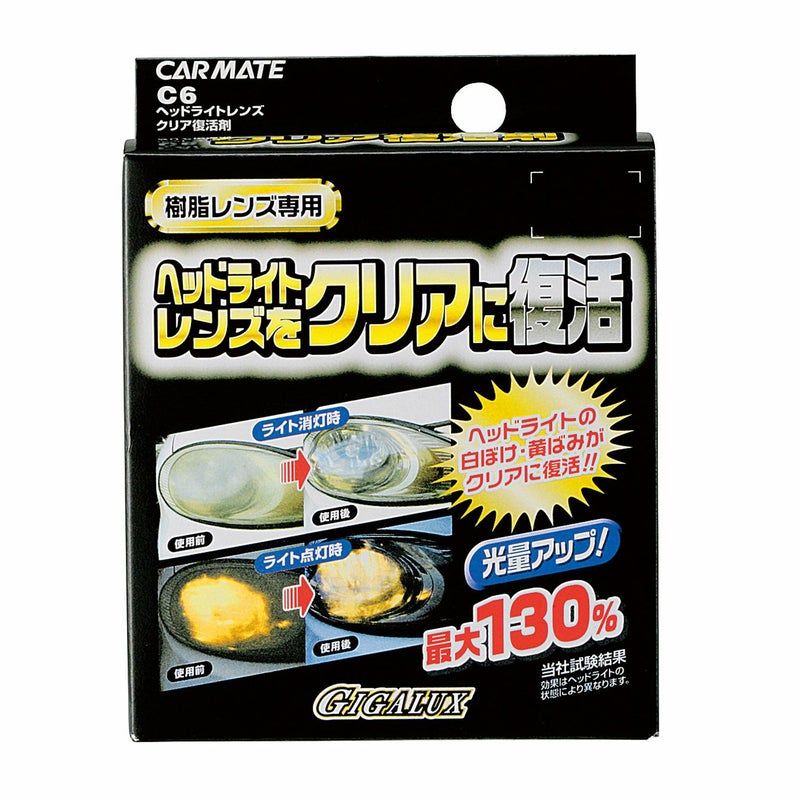 ヘッドライト、テールランプ、ウィンカーの樹脂レンズの白ぼけや黄ばみがクリアに復活します。内容量50ml。
