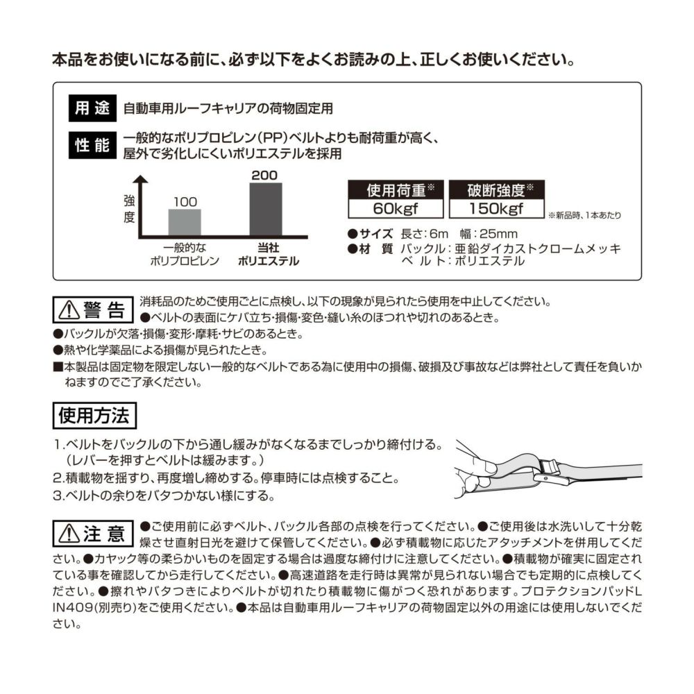 他の画像を見る 高強度ベルトとメッキバックルで積載物をしっかり固定 IN821 ハイグレードベルト220 メーカー希望小売価格 ¥ 2,200 販売価格 ¥ 2,200 税込 高強度ベルトとメッキバックルで積載物をしっかり固定 詳細を見る お気に入りに登録する
