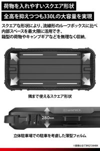 スクエアな形状なので、流線形のルーフボックスに比べ内部スペースを最大限に活用でき、箱型の荷物やキャンプギアなどを無理なく収納できます。