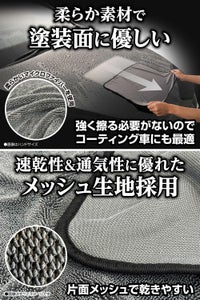 洗車後の濡れたボディやガラス面に吸水面側を広げて置き、手前にゆっくり引っ張って水滴を拭き取る。