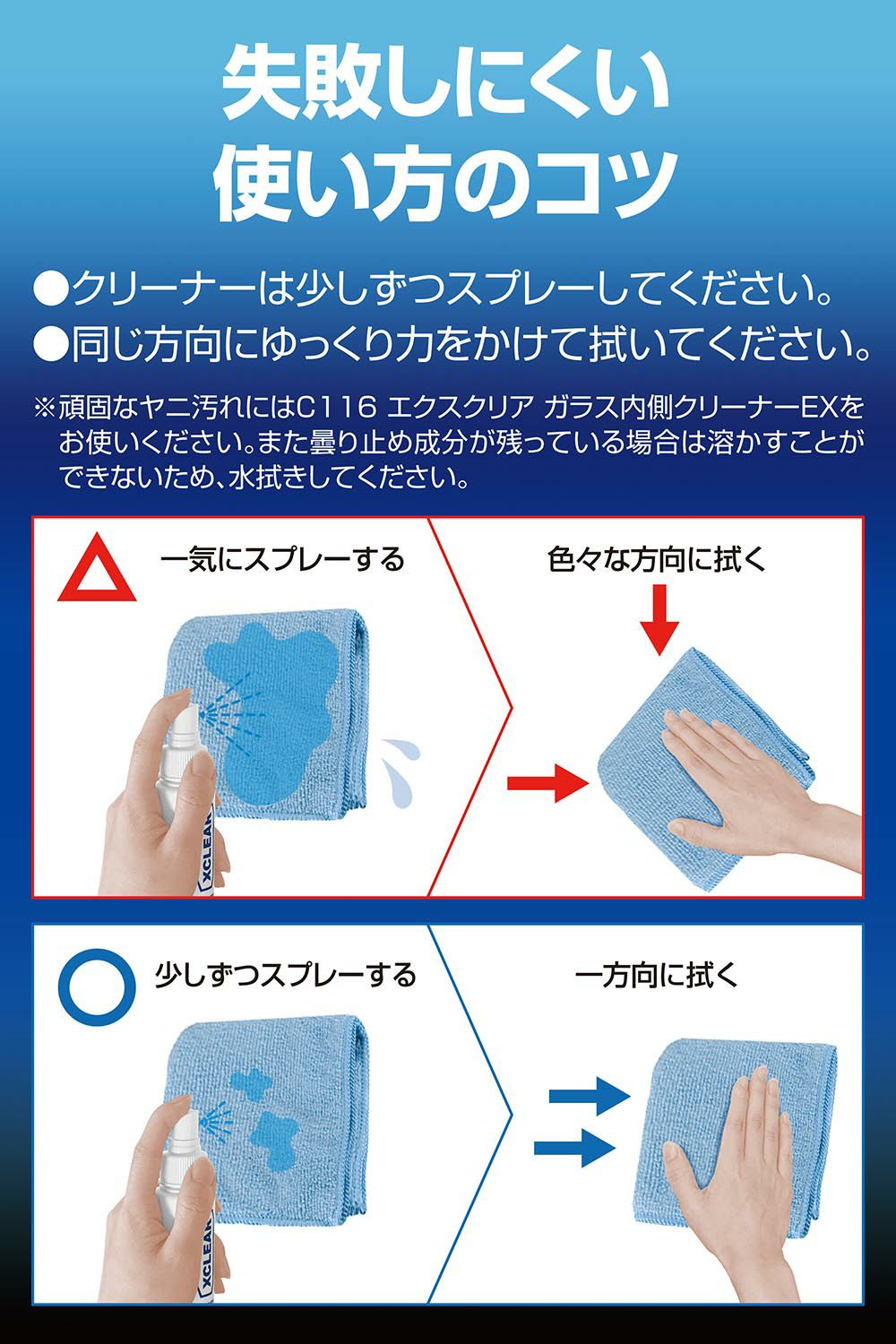 他の画像を見る 拭きスジや拭きムラを残さず、クリアに仕上げるプレミアムクリーナー C116 エクスクリア ガラス内側クリーナーEX 販売価格 ¥ 1,180 税込 拭きスジや拭きムラを残さず、クリアに仕上げるプレミアムクリーナー 詳細を見る お気に入りに登録する