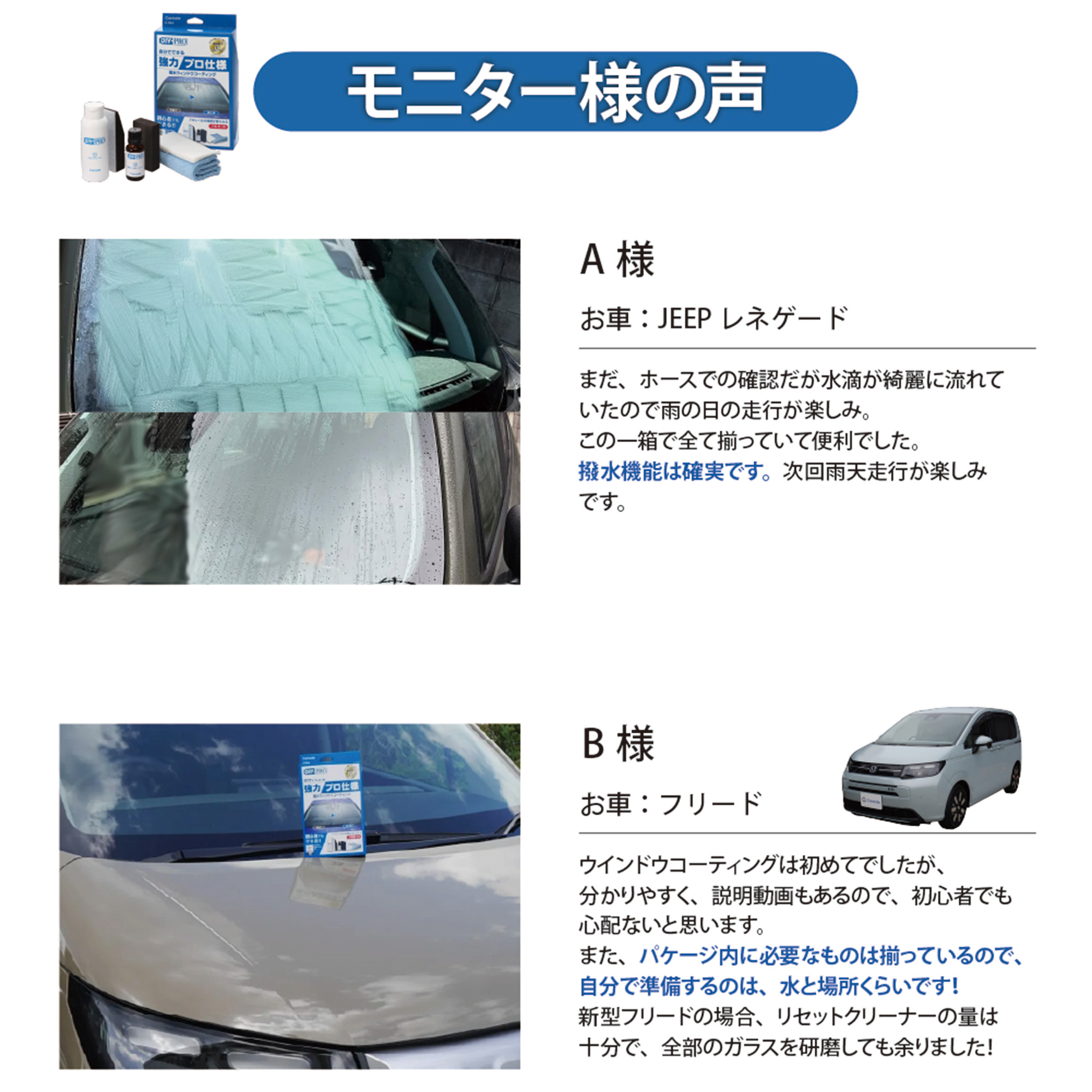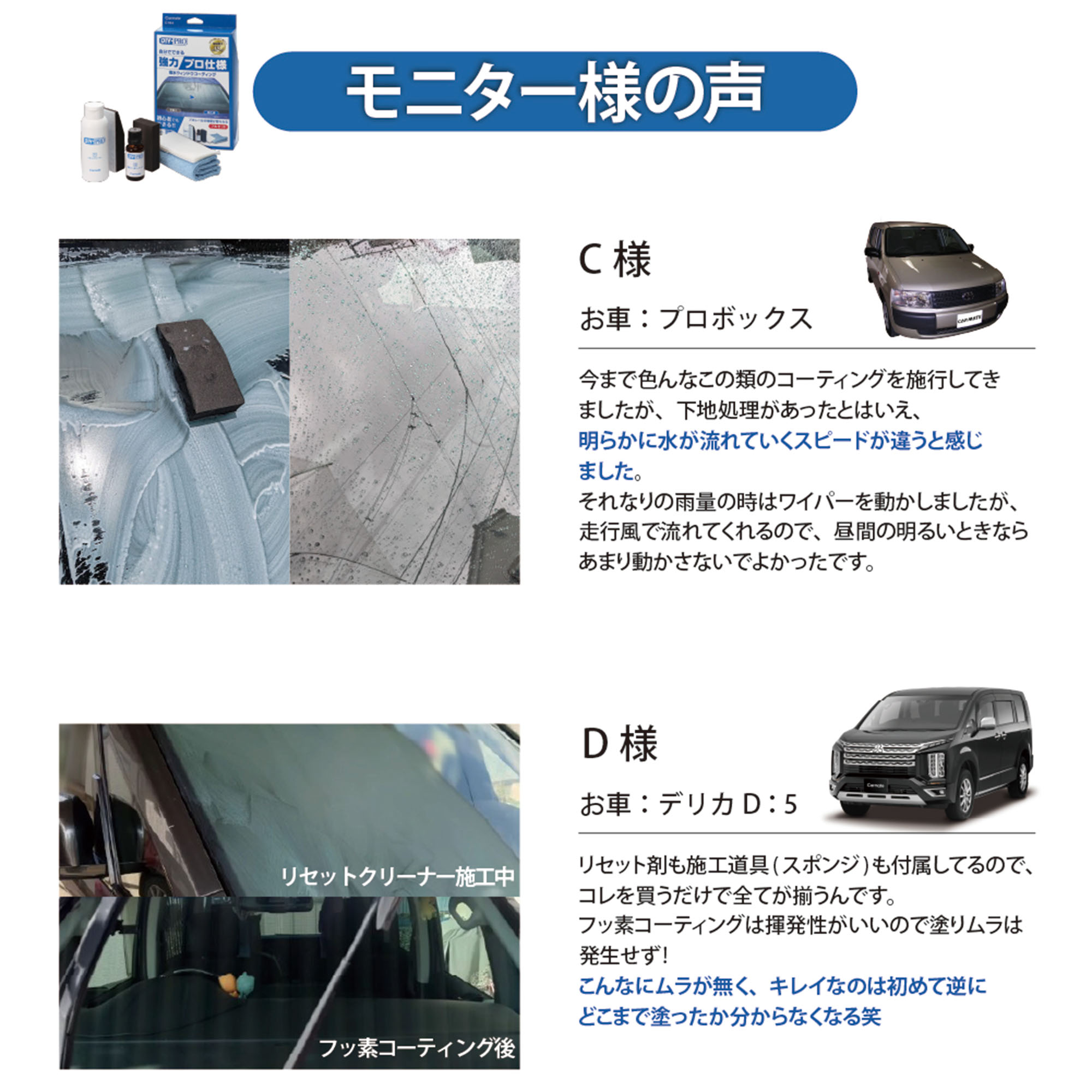 本品は、シリコーン系コーティングよりも耐久性が高い、ガラスと密着する「フッ素系コーティング」です。