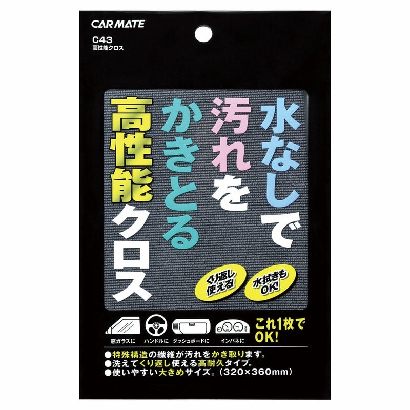 ガラス、ハンドル、ダッシュボードの汚れを落とす高性能クロス。フラット形状の特殊繊維が汚れを残さずかきとります。サイズ320mm×360mm。