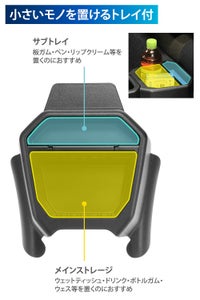 フタを取り外した時の収納例:サングラス、折り畳み傘、ペットボトルのドリンク、後部座席の乗員のスマートフォン