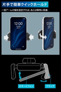 最初にスマートフォンの幅に合わせてホルダーのアームをセッティングすれば、それ以降は片手で簡単にホールドすることができます。スマートフォンをアーム内側に当てながら押し込むだけで、横からのバネの力でスマートフォンを保持します。また、ホールドされたスマートフォンを手前に引くだけでホールドが解除される構造なので取り外しも手間なく簡単にできます。